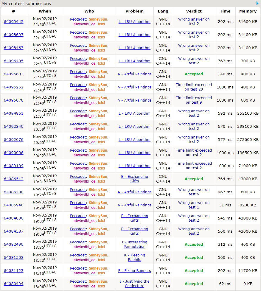 lcd帮lmh看代码,随后sds开出L的哈希先上机。lcd看了一会,觉得lmh的代码没有问题,转头看sds的idea,也觉得没有问题,于是看B。期间lmh提出了几个可能的WA点,都被lcd否了。sds写完获得TLE,测出本地跑了30s。lmh发现sds用的unordered_set做哈希,建议他换成sort+lower_bound。sds改完依然TLE,于是lcd帮他写了个基数排序,sds改完WA了。sds换了几种哈希姿势,却没有进展。