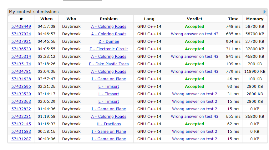 今天我失误比较大,开场写I结果WA了,最后还是要用高贵的SG函数。中间一大段时间都浪费在I上面,而且整支队伍的进度也提不上去,wyx写了A但是WA,期间排名一直十分靠后。在最后一段时间内我提供了E的思路并由wyx完成,比较顺利,并且D题也被码过。最后五分钟我还找出了A题代码会出错的数据,特判过了。这场最终结果还可以,就是前期比较受阻。感觉我在这场有点划水,代码都没写过完整的...