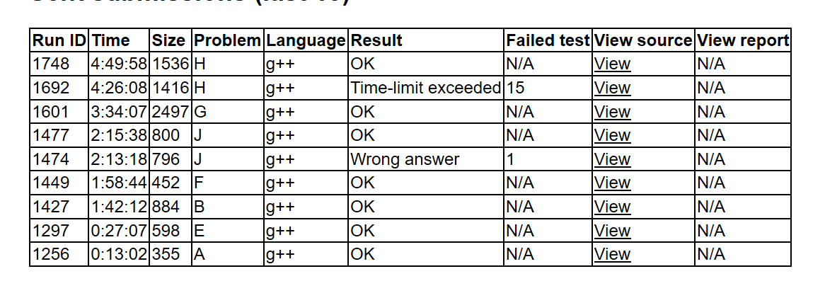 F题结论题开始不知道,但是看到有人几分钟过题应该猜一猜,G题想出来一个接近正确的做法但是没有考虑完全,不过好在队长及时提出反例,应该注意求最大和的时候选大数是更优先的,H题时间复杂度算错了,超时一次,把bfs复杂度当成O(点数) ,没考虑n2的边数