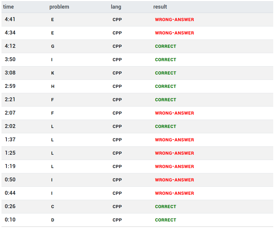 要总结的话,感觉这场暴露的问题主要还是思路跟不上,很多题不能说不会但思维速度明显慢于其他队伍,然后罚时差距越积越多。