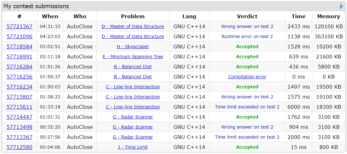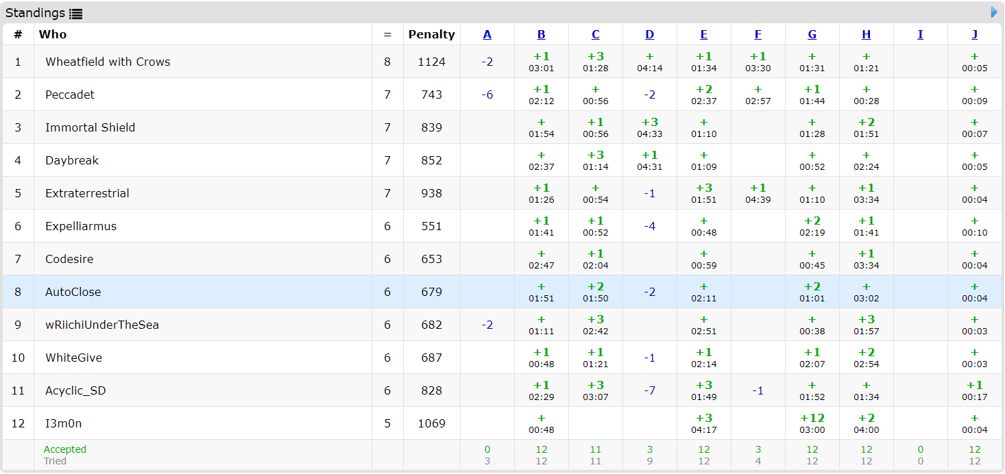 今天主要是代码实现能力不足的问题暴露得比较严重,导致题数虽然中规中矩(勉强不算太差),但前中期罚时基本不能看。