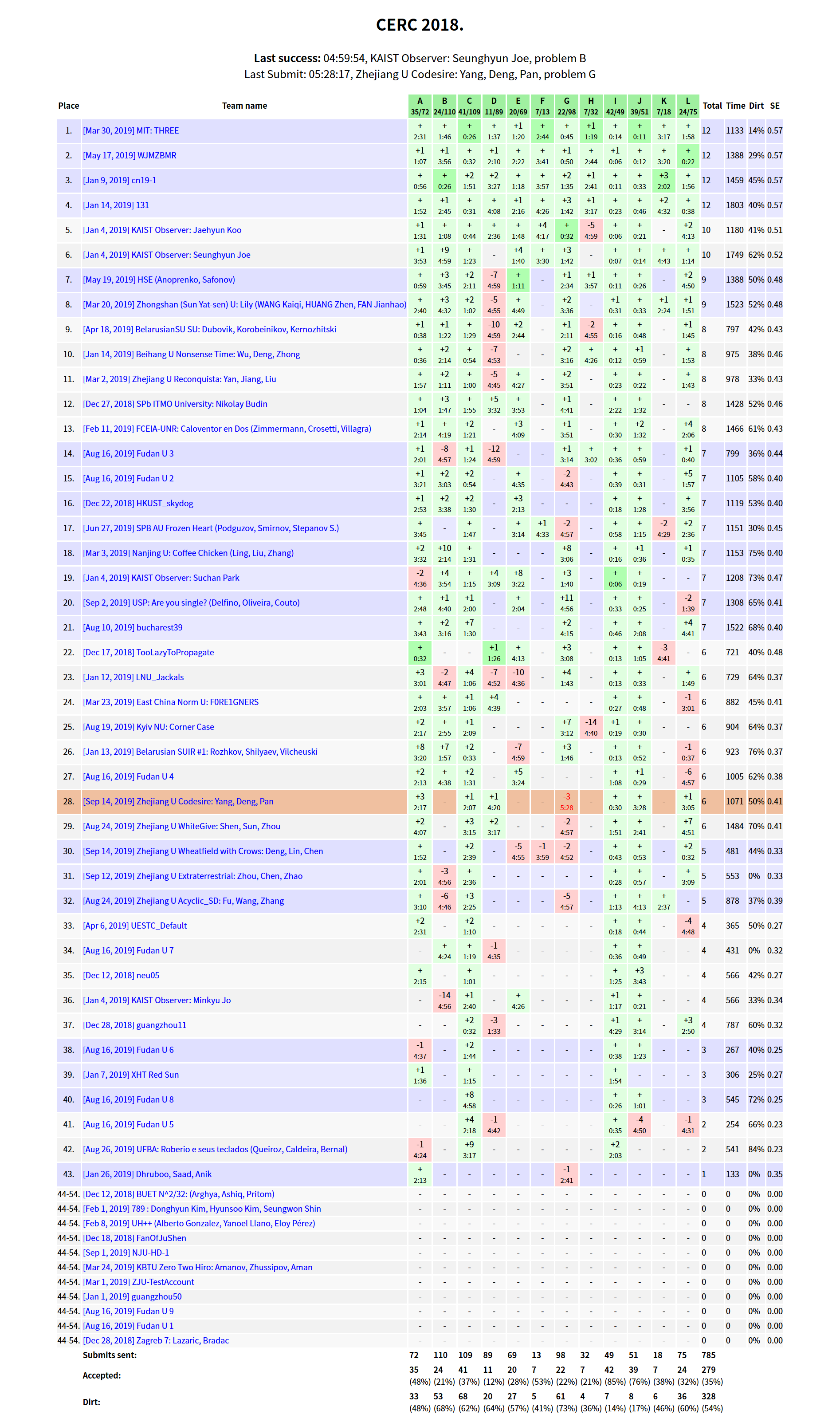 我感觉我在哪里见过L题,是一个不公平游戏的博弈题,但是不是特别确定结论,就没有最先写。和peh讨论了一下I,我上去写,过了。dzf看了A,有思路,就写了,是对AC自动机的改写,然而有点曲折,最后还是过了。期间我和peh看了一下其他题的题面,C题的题面非常“耐人寻味”,好在peh最后看懂了。上去写的时候做法有点问题,然后我提了一个不标准的做法(难以证明、复杂度成迷的做法)就过了。后来我写了L,结论没记错真是万幸,虽然WA了一发,最后的情况漏了一个细节。J,peh单挑一发过。D题是神奇的物理题,peh物理大师上去先写了一发,挂了。我们看了题目之后,对题面产生了怀疑,我甚至产生了弃题的想法去做BG。最终我们还是在题意不明、没有clarification的情况下尝试了这题,推了相当久的物理公式,写了一些鬼都看不懂的变量名(我们过了以后半小时都不知道写了啥),脑袋都要掉了。封榜后,考虑G,WA,没办法。