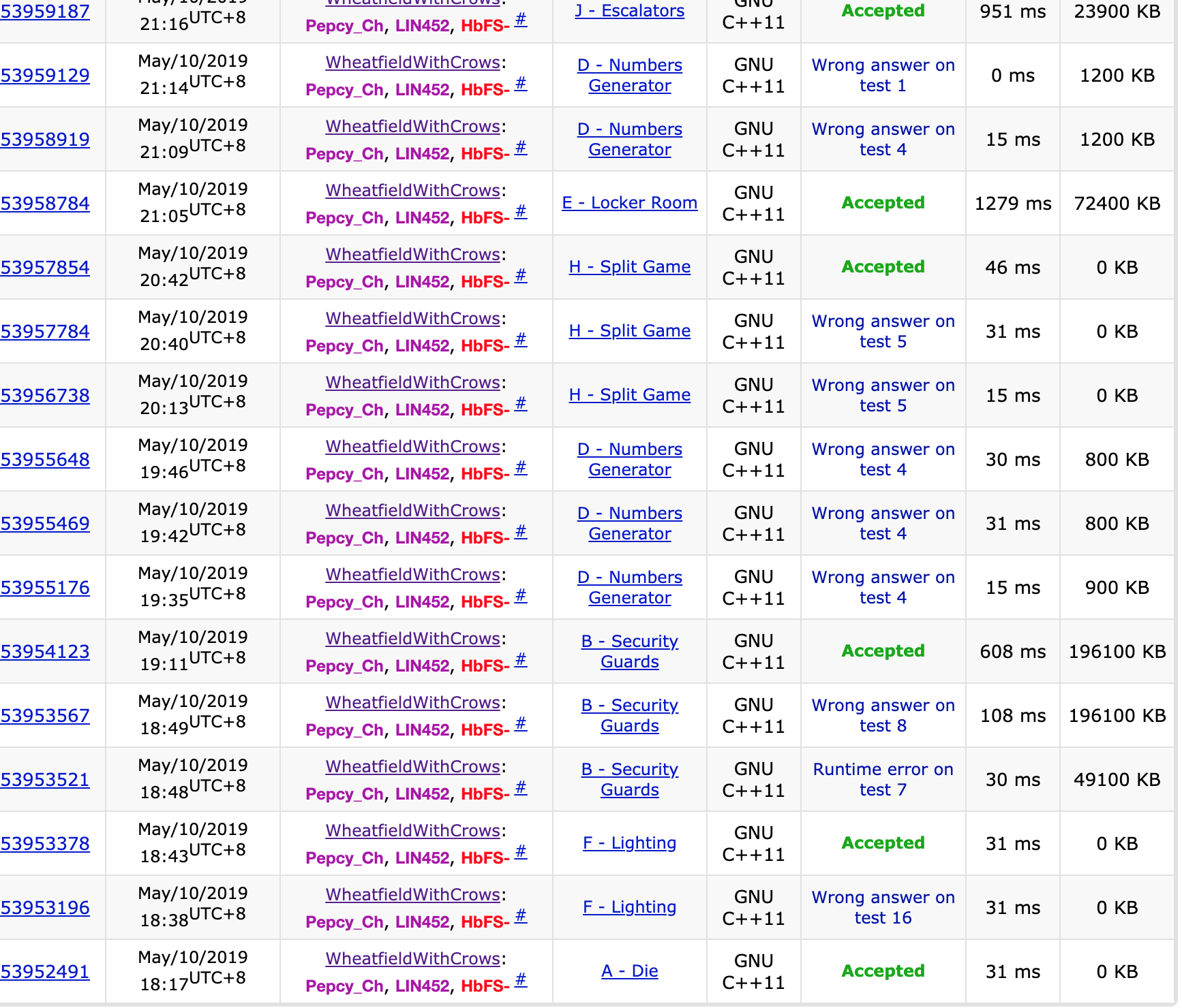 之后从 dhr 那里听了 G 和 D 的高消做法、E 的后缀数组做法,dhr 也提出了 G 的判奇偶的做法,但我当时好像在想另一道题于是 G 就不了了之了?