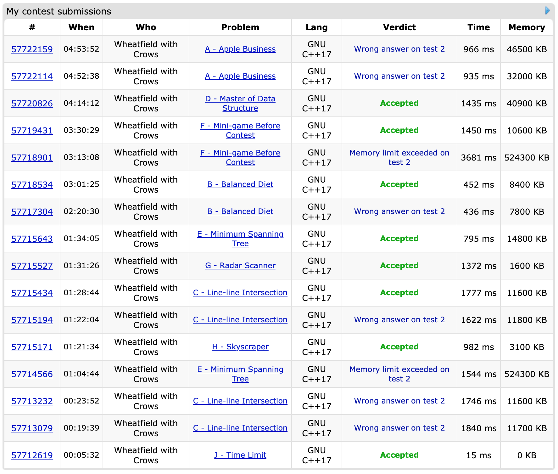 最近和博哥鬼混感觉心情很不错,比赛开始前的时候也比较放松。开局的时候cyw的C题就歇逼了,交了两三次都没过题。我瞄了一下榜发现前期快速过题的队伍,过C题的反而不多,于是让cyw弃了C题开他比较有想法的E题,交上去之后MLE了第二个点。这个时候我感觉到cyw的情绪非常糟糕,看到手上有很早就开好的G题,突发奇想不如就让cyw弃两个题开第三个吧。一是觉得他心态有点崩,让他搞个水题回一回血,省得他坐在机下总是感叹自己。二是认为G题代码不复杂,他写了就能过,应该不会让他更自闭。没想到这个操作让他比较顺利的读过了前期,在15分钟左右的时间内连续通过了三个题。