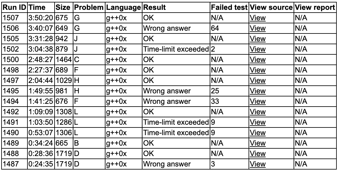 之后想 C,因为忘记平方而晚开出好久的样子。感觉 G 在哪见过,记得是 LYK 去年七月过过的题(赛后发现是去年七月的第 6 场的 A)。