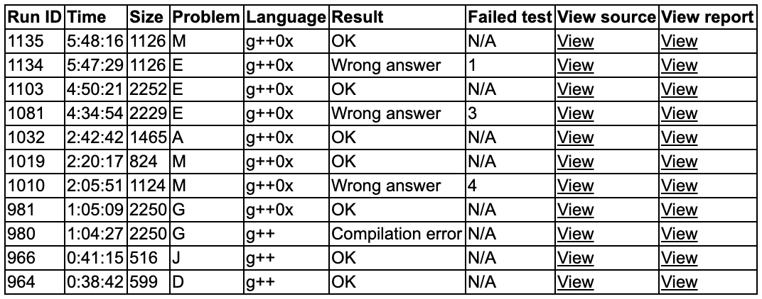 之后又打了一会儿工,看榜觉得很抽象,锁定了E、F、L题作为目标,人手一个题做得可开心了。随后三个人用力开题开了很久的题目,期间我问了一下lsy对E题的想法,她把她的想法告诉我之后顿时让我感觉打开了新世界的大门。顺着她的N^4^动态规划的思路,浩然通过二进制预处理把复杂度降到N^3^,随后和cyw将dp转到了DAG上来做把复杂度降到了N^2^。看到离比赛结束之后50分钟并且代码有点复杂决定all in。三个人傻乎乎地盯着代码找了几个错误很快通过了这个题。