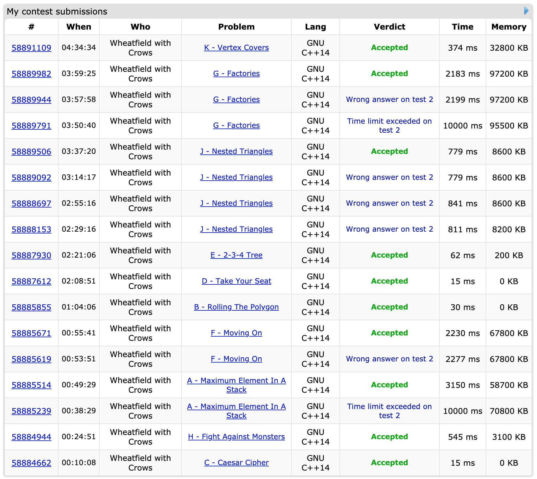 这场比赛好像全程都很快乐,难题很早就被开出来很早就开始写,机时用的会比较充分但是节奏会有点慢,但是全世界都过的G题我们很晚很晚才证明出来复杂度然后上去写。