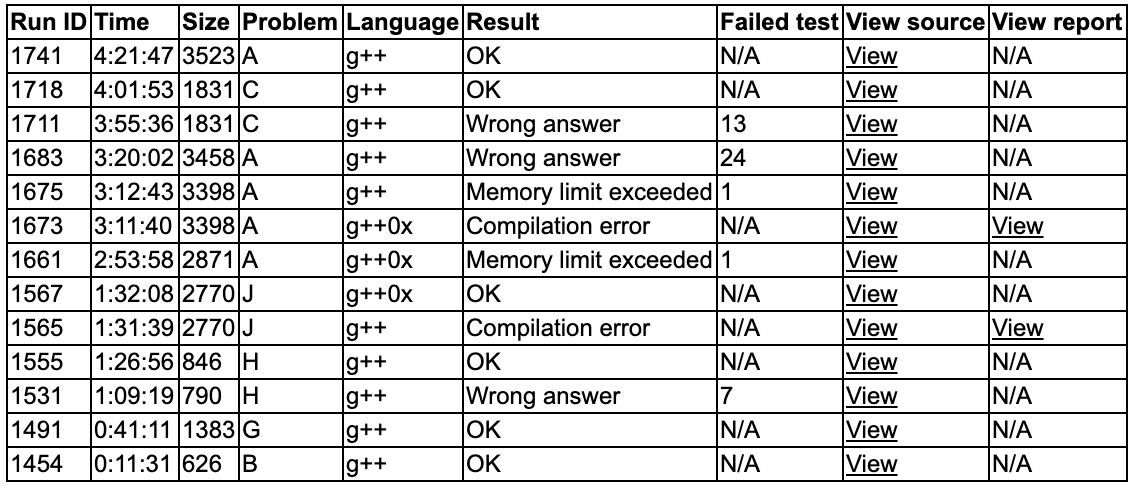 接着去搞A题, 结果最后通过时间比提交时间多了一个多小时,中途经历了两次把MLE改掉(set和queue的内存占用好大啊),一次CE(原来end是系统关键字,还是老老实实交g++的语言就好了),和一次WA24