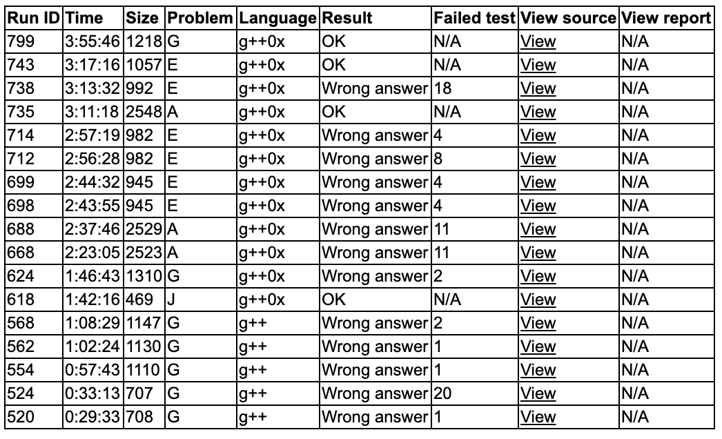 期间 lsy 与 dhr 出了 E,我去帮写了一个高消后 WA 4,我指出 dhr 的判无解似乎有问题于是去改了改,WA 8,发现一处重大问题后 WA 4(此处真的不能理解一个相对更正确的代码居然 WA 得更早了)。