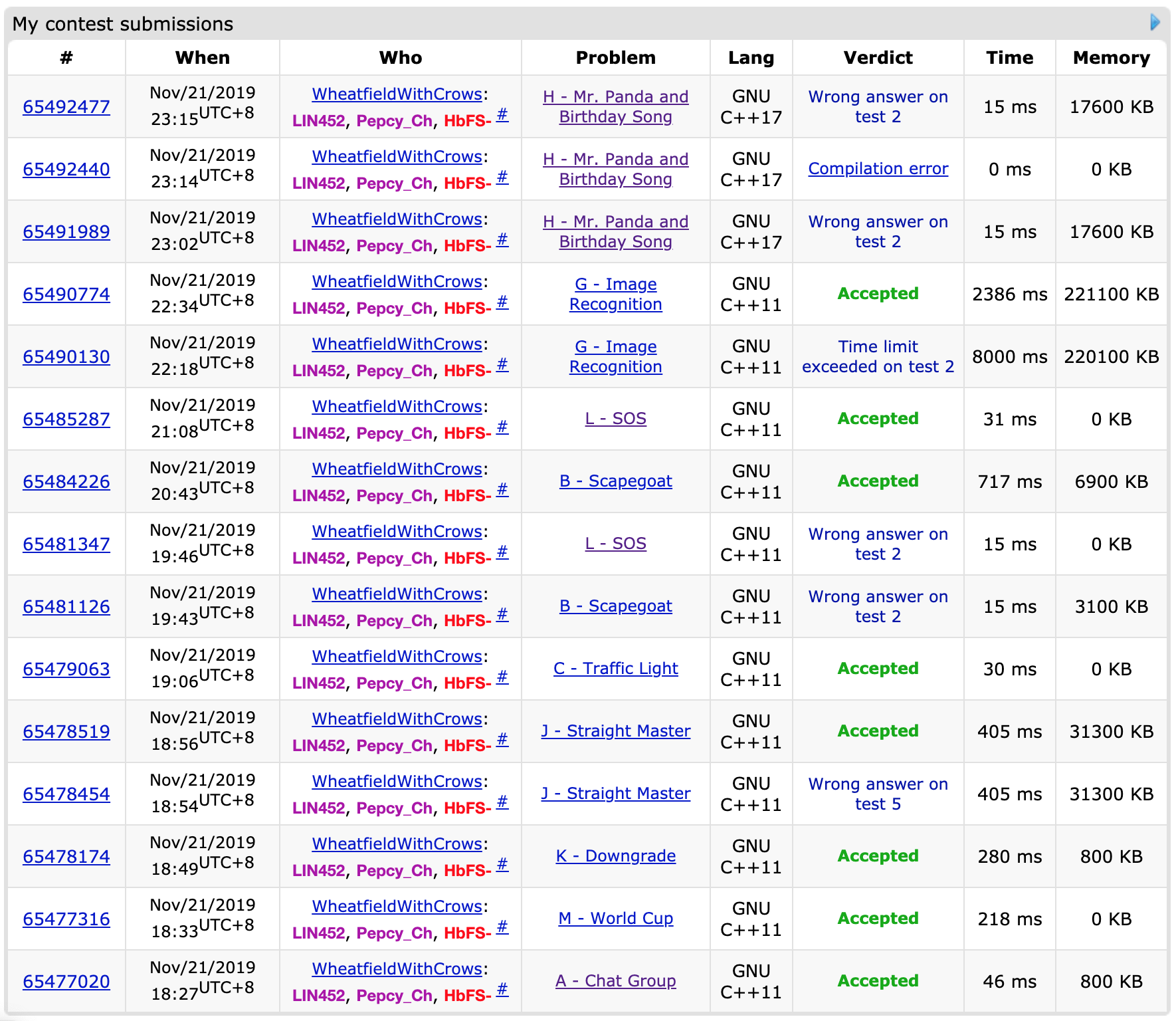 自己的H题有进展,但是由于细节很多,一直没理清楚。中途被拉过去讨论了一波B,写了第一个题。然后继续想H,最后和dhr讨论出了一个比较麻烦的做法,最后写完过了样例之后提交没过,比赛就结束了。