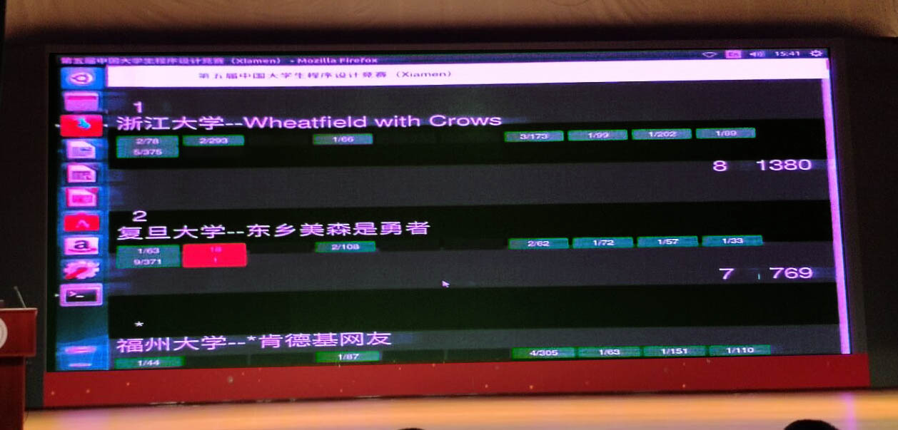 dhr读了很久的A题的题意并没有读懂,但是榜上A题已经有队伍过了。于是让lsy来读A题,cyw读D题,dhr继续去看G题。lsy和cyw相继开出手上的题目,在开场一个小时左右队伍开始通过题目,A58(1),D66。