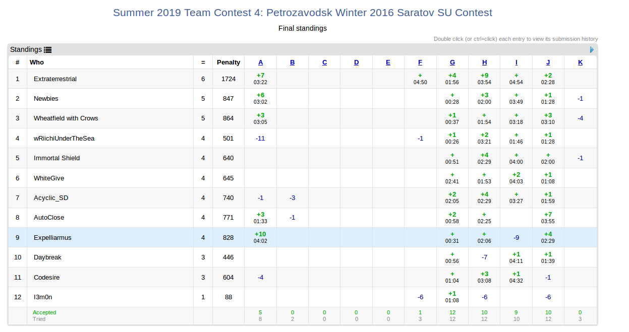开场分别看题, zkx 看了 A 跟 YPL 讲, 之后看 BCD , YPL 看了 IJK , I 没看懂。 这时候看了一下榜, 让 yay 去看有人过了的 G 题。 之后 yay 上来写 G 并过了(+0 31) 。 之后 zkx 开始写 J , 写了 20min 并一直没过。 与此同时 YPL 在想 H , 发现 H 可做, 想完回去想 A , 发现 A 好像也可做。 之后 YPL 上去写, 觉得 A 比 H 好写就先写 A , 先 MLE 然后卡空间扩大枚举范围, 之后 WA116 。 暂时把 A 题放了, ypl 写 H , 20min 后 1A (+0 126)。 与此同时 zkx 和 yay 在讨论 J 题做法。 之后 yay 去重写 J 题, 并在半个小时后过掉了(+4 150)。 这时候 YPL 在查 A 题代码, 扩大范围并 WA 186 。 zkx 帮 YPL 改代码, 用 bitset 再次扩大参数, 仍然 WA 186 , 这时候决定放下 A 。 这时候 zkx 根据 YPL 错误的题意开始想并写 K 题。 一个小时后 YPL 发现了 A 题的问题, 加了一个 random_shuffle 交了几发过掉(+10 242)。 期间 zkx 发现了 YPL K 题题意是假的。 之后 YPL 和 yay 讨论 H 题, 找到了一个 n sqrt n 的算法, YPL 让 YAY 来写, 写完调完到最后, 发现 TLE 。