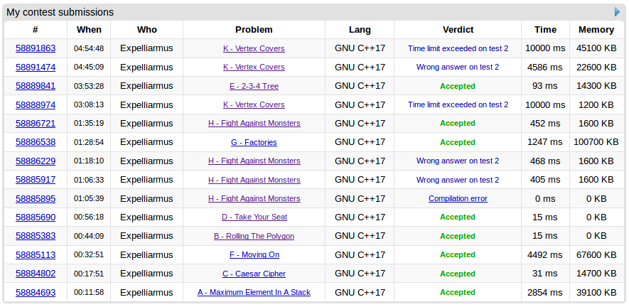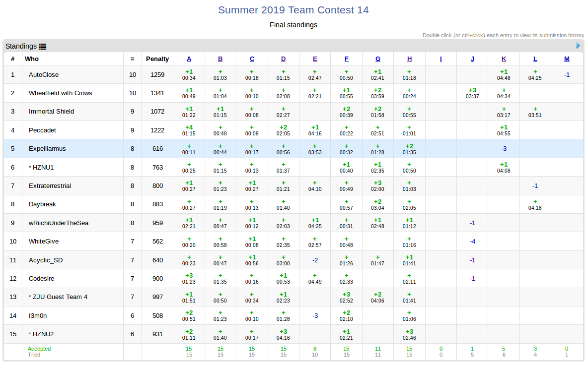 期间 YPL 想到了 L 题和 M 题做法, M 题太难写直接放弃, L 题本来可以写, 但觉得 YAY 能过掉 K, 就一直让 YAY 写, 最后没时间做了。
