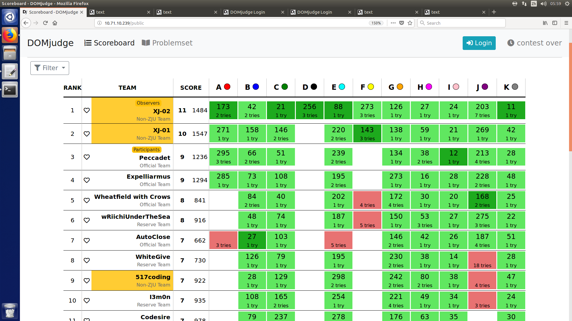 开场tjc看出K题可做写了10分钟发现看错题了,改了一会才过,K1y22,hyw秒出H并上机花了2分钟写了一发,wa了,这时候榜上一堆人过I题,tjc去码了一下,I1y27,hyw继续改H,tjc和yyc讨论B解法,当hyw再次wa的时候yyc上机写了一发B,B1y48,写B的时候hyw看出哪里写错了,上机改了一下,H3y53。这时没题可写了,三人分别开题,tjc看C、yyc看G、hyw看J,tjc最先想出来,讨论了一下解法就上机写了,C1y74,tjc去想E,yyc上机写G,G1y150,期间E和J都想出来了,由于榜上J题没人过,tjc先去写了E,E1y187,接下来hyw写J,tjc看A,yyc看F,yyc先想出F是个最小树形图问题,对着板子分析了一下感觉由于边权有特殊性可以直接跑过去,于是趁J题wa的时候写了一下,交上去T了,调了一会以后hyw发现J题比较函数没开long long,改了一下交上去就过了J3y275,最后25分钟尝试调F、写A的乱搞、写F的乱搞,都没有AC。