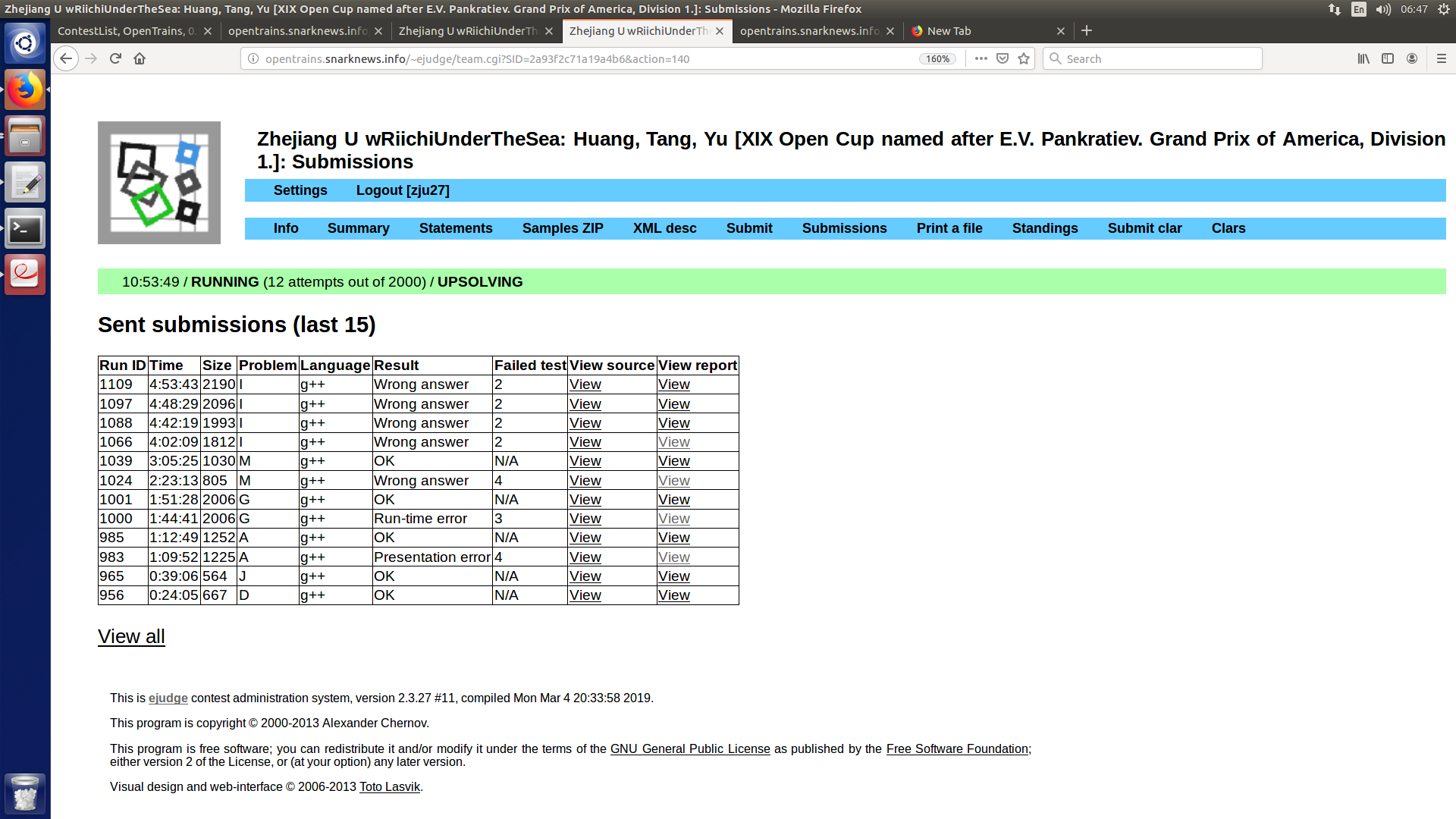 上来发现D是个类欧板子题,D1y24,又听说J是签到,J1y39,很快tjc开出A,A2y72,yyc说做过G的原题,推了一会儿上去写了,G2y111。这是hyw上去打了一个M的表,找到了判合法的方法,yyc给出了一种统计答案的方法,Wa了,打了个更详细的表,三人一起YY出了一个统计答案的方法,随便找了几个例子发现可行,改完就过了,M2y185。后期分别看过K、E、L等题都没有思路,hyw给出了一个I的贪心方法,跟tjc说了一下,tjc觉得可行,hyw上机写I。最后tjc和yyc推F的积分,hyw调I,一直Wa2,F推出来但是来不及写,最后I也没过。