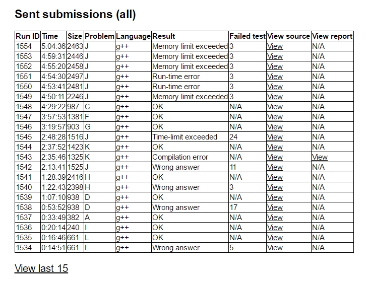 开场打印题耽误了几分钟,然后tjc签了L和I,L2y16,I1y20,三人yy了一波A的构造方法,A1y33。然后tjc开出D,D2y67,期间hyw给出了H、F的真做法和K的假做法,yyc给出了J的做法。yyc修正了一下hyw的H的做法后上机,H2y88,hyw上机写J的dp,一开始wa,在机上调了一段时间修正了算法,喜提Tle。这时tjc和yyc讨论出K和G的正解,tjc写K,K2y157,yyc写G,G1y199。hyw等到机位,思考了一下写F还是改J,最后选择写F,F1y237,这时tjc看出C是个欧拉回路,找了个板子就上机写了,C1y269。hyw试图写个Trie优化一下J的时间常数,最后Mle,没有调完。