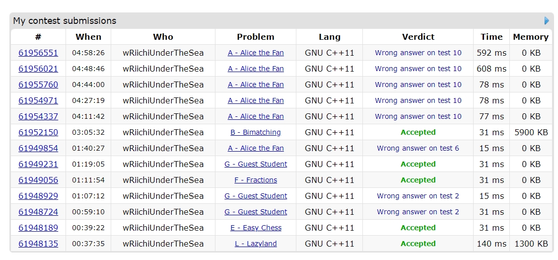 upd10.15 看了一些队的trac,想了一下今天的A,回想了五六年的算法竞赛经历,像今天的A这样一个写起来明显不简单而且写之前思路很不清晰,完全是抱着侥幸心理寄希望于不出特别大锅一两次能过的做法,现在来看是严重不合格的,这直接导致了这一场的崩盘。当时之所以这么做,一是因为很多队过了A,二是因为我们队没有开出别的题而机位空了出来,这个时候队友催我上去写A,我自己虽然有点犹豫而且自知没有想清楚,但看到大家都过了其实自己也很急,现在一想来当时三个人都是出于非常不冷静的状态下做了这个决定,我自己身为队长没有拿捏好,而且作为写题的人没有尽到应尽的责任,是非常不应该的。对于解决的方法,我想遇到这种情况一是队长要掌握好比赛的节奏,逆风时千万不能慌乱,每一个题都要稳扎稳打,第二是如果遇到机位空出来而写题的人没有想好,宁可浪费一些机时给写题的人多一些时间思考,事实证明可以省掉大量的调试时间。
