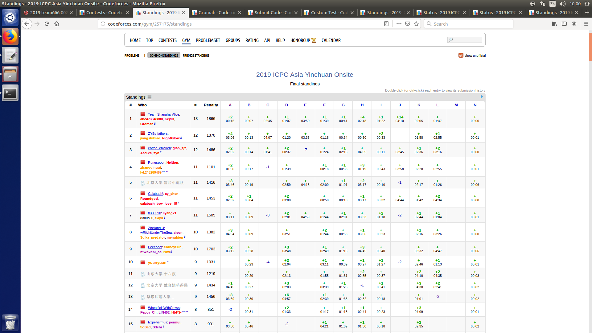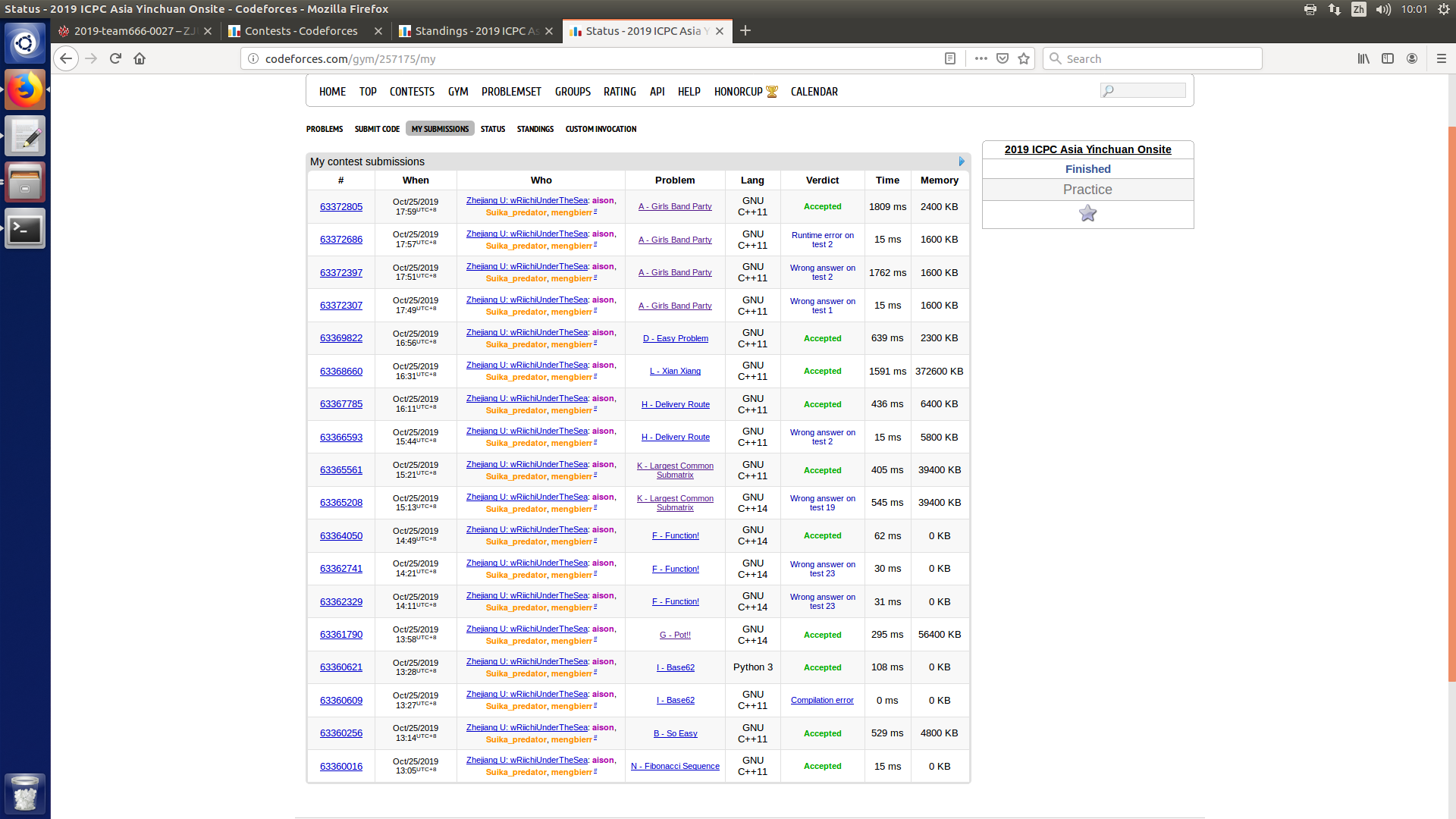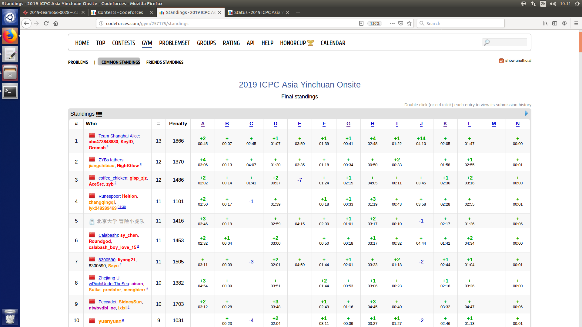 开场tjc'''1y0'''拿下N题1血。然后tjc签了B,'''B1y9'''。tjc读了M丢给了hyw,hyw试图推了半个小时式子,推完跟tjc说的时候发现传达题意的时候有一个细节tjc说了hyw没听到,于是做法假了。又讨论了一下H,觉得是个可做题但是不好写,应该丢到中后期。中间队友过了I,'''I1y23''',后来tjc和yyc讨论出了G,发现是一个很简单的ds题,很快'''G1y53'''。写G的时候hyw在寻找可做的题,但一直没找到。G过了以后yyc开K题,hyw很快发现F可做,和tjc讨论出了一下,很快发现只要分个块就好了,hyw上机写F,写完wa了,改了一个可能构成错的上下取整和取模,还是wa,tjc也看不出错,就这样三个人一起看了10分钟,yyc看不出就接着去看K,tjc和hyw又查了一会儿,又过了5分钟tjc发现有一个细节可能炸ll,改完过了,'''F3y104'''。这时yyc开出了K,跟tjc讨论了一下觉得可以写,于是yyc上机。yyc上机的时候hyw和tjc找可做的题,觉得A、H、L都可以做。两人先大致讨论了一下A,讨论出了一个暴力的做法可以过。然后又去开H,发现只要缩个点就行,细节有点多。权衡了一下决定hyw写A,tjc写H,tjc先写。这时yyc的K过了,'''K2y136'''。tjc上机写H,hyw之前读了L,觉得L可能比A更好做,跟yyc说了一下,两人觉得应该是个状压dp+预处理,一起把细节推清楚之后hyw准备上机,这时tjc的H题wa了,hyw写L,yyc试图开E题。中间tjc查出错把H改了,'''H2y186'''。因为L准备比较充分所以很快过了,'''L1y206'''。这时tjc和yyc开出了D,tjc上机写D,hyw和yyc把A的细节推清楚,推的过程中yyc给出了一个更好的写法。讨论快完的时候D题过了,'''D1y231'''。这时hyw写A,tjc和yyc寻找能不能再开出了个题来,讨论后决定选择冲刺C题。hyw在机上写A写了20分钟非常痛苦,由于还是有细节没推清楚进展不多,这时C题感觉推不出来了,于是留tjc一个人开题,yyc和hyw商量了一下分工写A题,hyw写预处理部分时yyc在草稿纸上写主函数,中间因为cin和scanf混用、清零以及数组大小挂了几发,最后在合作下通过了A题,'''A4y294'''。