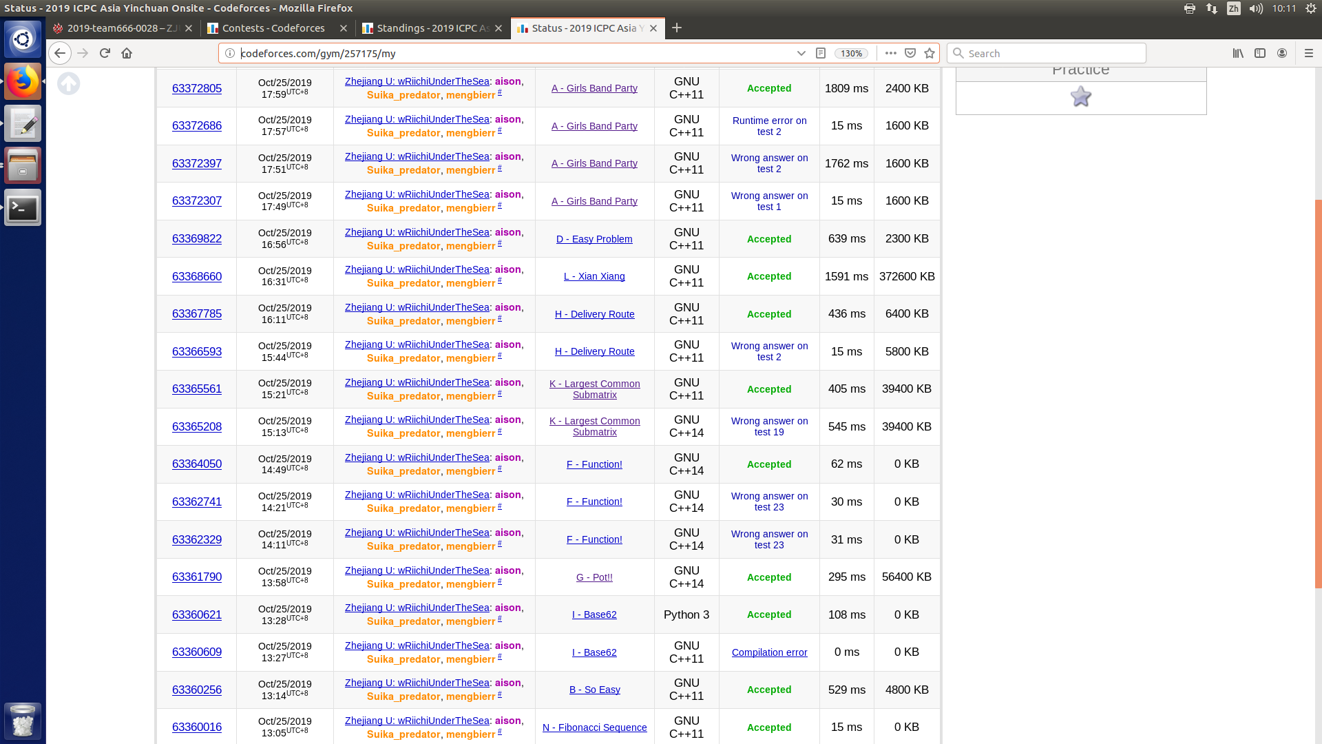 开场tjc1y0拿下N题1血。然后tjc签了B,B1y9。tjc读了M丢给了hyw,hyw试图推了半个小时式子,推完跟tjc说的时候发现传达题意的时候有一个细节tjc说了hyw没听到,于是做法假了。又讨论了一下H,觉得是个可做题但是不好写,应该丢到中后期。中间队友过了I,I1y23,后来tjc和yyc讨论出了G,发现是一个很简单的ds题,很快G1y53。写G的时候hyw在寻找可做的题,但一直没找到。G过了以后yyc开K题,hyw很快发现F可做,和tjc讨论出了一下,很快发现只要分个块就好了,hyw上机写F,写完wa了,改了一个可能构成错的上下取整和取模,还是wa,tjc也看不出错,就这样三个人一起看了10分钟,yyc看不出就接着去看K,tjc和hyw又查了一会儿,又过了5分钟tjc发现有一个细节可能炸ll,改完过了,F3y104。这时yyc开出了K,跟tjc讨论了一下觉得可以写,于是yyc上机。yyc上机的时候hyw和tjc找可做的题,觉得A、H、L都可以做。两人先大致讨论了一下A,讨论出了一个暴力的做法可以过。然后又去开H,发现只要缩个点就行,细节有点多。权衡了一下决定hyw写A,tjc写H,tjc先写。这时yyc的K过了,K2y136。tjc上机写H,hyw之前读了L,觉得L可能比A更好做,跟yyc说了一下,两人觉得应该是个状压dp+预处理,一起把细节推清楚之后hyw准备上机,这时tjc的H题wa了,hyw写L,yyc试图开E题。中间tjc查出错把H改了,H2y186。因为L准备比较充分所以很快过了,L1y206。这时tjc和yyc开出了D,tjc上机写D,hyw和yyc把A的细节推清楚,推的过程中yyc给出了一个更好的写法。讨论快完的时候D题过了,D1y231。这时hyw写A,tjc和yyc寻找能不能再开出了个题来,讨论后决定选择冲刺C题。hyw在机上写A写了20分钟非常痛苦,由于还是有细节没推清楚进展不多,这时C题感觉推不出来了,于是留tjc一个人开题,yyc和hyw商量了一下分工写A题,hyw写预处理部分时yyc在草稿纸上写主函数,中间因为cin和scanf混用、清零以及数组大小挂了几发,最后在合作下通过了A题,A4y294。