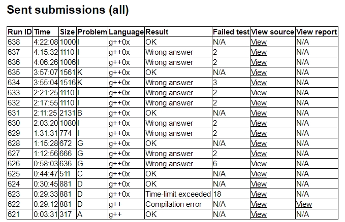 出门yyc签了A,A1y3,然后跟榜,队友签了C、D,D1y30,C1y44。这时hyw和yyc讨论G题,遇到瓶颈,喊tjc来看,tjc给出了一种可行解,于是hyw写G,挂了一发以后tjc帮忙查出一个细节写的有问题,G2y75。这时yyc冲上去写I,顺便看到榜上B和H都过了一片,hyw和tjc讨论H,得到了一个很不好写的做法,于是先放着。这时yyc的I题wa了两次,hyw去看J,yyc和tjc讨论出了B题,tjc写B,B1y131。hyw有一个J的三分做法但感觉不一定对,而且很难写,于是也扔了。这时yyc看F,tjc和yyc接着讨论I,yyc冲上去写I又挂了两次。这时机位空了,也没有题可写,hyw给tjc讲了一下F的题意tjc,tjc想了一下不会做就去看K,hyw和yyc继续研究I,hyw想出了一个关于gcd的做法,机位空了20分钟以后hyw决定去打个I的表,发现gcd大的时候可能不好做。卡了半个小时I以后hyw因为开不出别的题继续想I,yyc去开E还是F,这时tjc想出了K,写了一会儿过了,K2y237。hyw把I的做法跟tjc讲了一下,tjc立刻想出了一个fix的方法,于是hyw上机重构I,中间因为细节一直过不了自己造的样例,后来又因为输出顺序原因wa了一发,最后I7y262。这时yyc上机写F,hyw重读了一遍E发现之前读的E假了,而且给出了做法,但是来不及写了。最后F没有写完。
