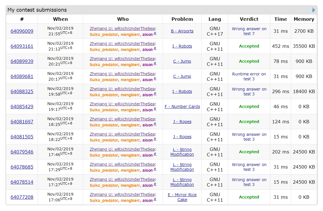 上来1分钟就看到有人过了L,tjc去看。一开始hyw看到了E觉得大概是个什么dp,还没想的时候被tjc丢了个L,5分钟的时候一看E过了一片,一看只要贪心就好,于是E1y6。这个时候tjc和yyc各自看题并交换题意,hyw想L,给了几个不对的贪心以后想到dp,觉得很稳就交了结果wa。tjc看了一下后删去一行再交,又wa。于是怀疑做法有问题,过了一会hyw给出了反例,fix了一下就过了,L3y46。这时榜上过了B和J,B之前没讨论出结果,又因为J看上去很可做而且过的人多到令人发指于是三个人就一起看J,结果三人一起卡了15分钟,tjc想到可以用prufer序列搞一搞,中间出了个小锅以后过了J2y85。这时三人各自开题,yyc给出了一个B的做法,和tjc讨论了一会儿,然后yyc上机写B,hyw把F的做法跟tjc讲了一下,tjc觉得可,这时yyc的B卡住了,于是hyw写F。后来B的做法假了,F题样例调了一会儿,F1y137。这时tjc说自己会I了就一个人去写I,hyw去救B题,yyc看C。后来I题wa了,yyc写C,tjc跟hyw讨论出I的正解,发现需要大改。这时C2y201,tjc接着写I。hyw卡了半小时B无果决定放弃B题,听yyc讲了一下剩下题的题意,讲到D题的时候yyc说是个经典不可做题,但hyw觉得应该可以做于是就去开了。yyc试图去开H题。封榜时hyw有事先走了,跟yyc交代了一下封榜后的安排,觉得B和H如果开不出还剩40分钟的时候就去帮忙I,结果I很快过了,I2y252。最后yyc和tjc搞B题,没有搞出来。