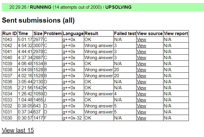 上来hyw读到了F,简单和yyc讨论了一下以后就写,然后F1y30. yyc、tjc讨论出了D,上机冲一发后WA了,发现没开ll再交又Wa。紧接着yyc上机写J,tjc和hyw讨论D,有了一个新做法,J1y64,tjc写D继续wa。这时yyc开出了K,和tjc简单说了一下,找了个sam的板就上机了,hyw想了半天H和tjc讨论了一下,没有进展。hyw接着想H,后来弃题去想D,tjc开出B题,和hyw讨论了一些细节以后决定更让tjc上机。后来K1y141,tjc写B,yyc去救D题,hyw得到了L的题意并给出了L的做法,但是觉得时限卡不过去就没敢写,于是去想I题。yyc给出了D的做法,跟hyw说了一下以后立刻上机,D4y185。tjc的B很早就写完了但是过不了样例,这时hyw读到了C,跟其他两人说了一下觉得可做,但是tjc说需要一些计时调B,考虑到B比较清晰于是先让tjc调B。大约半小时后B依然没有调出来,于是hyw把tjc赶下机去写C。期间yyc思考I题,没有进展。B调了很长时间最后B3y246,C写好了以后因为模数太大的问题一直wa,直到比赛结束前三分钟才发现,改完后赛后1分钟通过了C题。