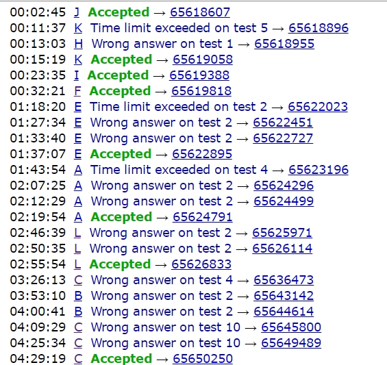 开场tjc签了J,J1y2,yyc签了K,K2y15。这时跟榜,tjc和yyc看F。hyw签了I,I1y23。这时tjc和yyc发现F是个傻题,F1y32。这时rnk4,榜上没题,于是三人各自开题。hyw和tjc说了一下E,想了一段时间后暂时搁置。后来hyw又和yyc讲了E这个题,tjc听的过程中发现忽略了一个细节,于是上机,中间因为奇怪的原因挂了好几次,E4y97. hyw去写之前开出来的A,后来A题T了,yyc说可以把spfa改成dfs版的,中间inf把0x3f开成了0x7f挂了几发,上然后A4y139。hyw读了B,表示需要上机打个表,然后yyc和tjc搞出了L,虽然wa了几次但很快找出错,L3y175。写L的时候hyw让tjc做写大模拟的准备,于是L写完后tjc写C,hyw试图找B的规律,yyc思考D题。tjc的C题wa了很长时间,中途hyw几次猜测规律上机但都没有过,后来tjc艰难地调出了C,C4y269。最后hyw和tjc还是找了很长时间B的规律但都没有过,yyc搞出了D但是过于难写于是弃疗。