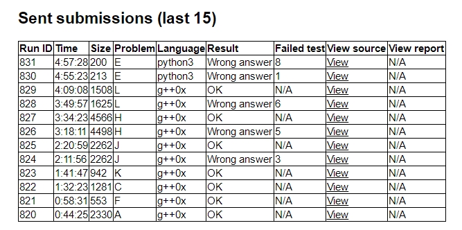 J,两人得出了大致做法。这时A1y44,然后tjc写F,F1y58。这时榜上没有人过J,但是有一些人过C,C是个之前读的凸包,于是hyw写了一会儿J以后让tjc先写C,C1y92。yyc给出了K的贪心正解,K1y101。然后hyw写J,因为打错了一个数wa了一次,J2y140。这时继续跟榜,hyw卡了很长时间的B题,yyc和tjc去想H题。后来两人讨论出了H,yyc在tjc帮助下写H,因为犯傻wa了一发,H2y214。hyw卡了一个小时B以后弃题去想L,在发现了一个重要性质后和tjc讨论出了L的正解,中间又因为犯傻wa了一发,L2y249。写L的时候tjc想了很长时间数论E没有想出来,于是hyw想E,tjc和yyc继续想B和D,最后时刻hyw发现了E的重要性质,但因为一些细节思考得不是很清楚最后没有rush过。