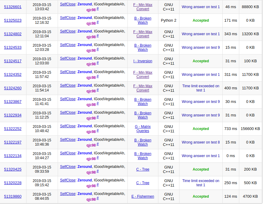 QJC开始想G,LFY想了会儿C,和QJC讨论讨论开始写。WCY太蠢了听了好久才明白QJC的想法,但是不太会实现,LFY写完C换WCY去电脑前发呆,期间LFY推出了B的式子,又把WCY换下去发呆。因为交错了代码 '''C 2y88''', '''E 1y39'''。LFY写了好一会儿,WA了,WCY想清楚了上来写,写了好一会儿,'''G 1y168'''。LYF改B心态爆炸,开始写F,QJC帮忙看B,WCY开始猜结论&瞎证明。F wa两发,上来莽I,'''I 1y238'''。LYF 把B用py重写,'''B 5y251''' 。大家一起攻F,wcy试着写,失败了。
