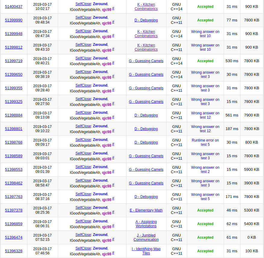 读题,wcy读完A想了想,看榜读I,I1y16。lfy读J,J1y37。wcy和qjc讨论了一下A确定了一些细节,A1y52。发现E复杂度对,wcy莽一发E1y103。期间lfy和qjc确定了G的做法,lfy上机写D,WA×1,wcy上机写G,WA×3。lfy改D,WA×3。WCY的sort语句出了不止一处问题,静态差错后G6y130。qjc把K摸了出来,亲自写,WA×2,lfy改D,D4y138。qjc改K,K3y152。lfy尝试H,期间wcy&qjc讨论C,但是wcy没想清楚。lfy的H出了问题,和qjc讨论,wcy一个人摸,从做法到精度都出现问题,心态开始发生变化。后一半时间毫无建树。