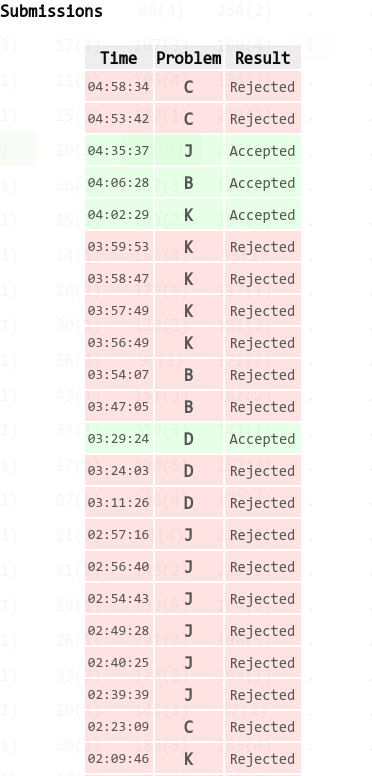 wcy写A发现A不那么简单,要维护一些很烦的东西。跳车写K,从第一发TLE开始不停怀疑读入、输出、马拉车有没有写对,TLE×4后心态爆炸跳车了。用三个单纯的人没有多想就达成一致的办法写C,WA了。这个时候林学长和qjc把J&D&B搞出来了,林学长上机写J,WA了,然后改了若干非致命错误,意识到做法有问题以后跳车了。写D,修改实现漏洞&corner case D3y209。期间qjc叉掉了J,给出了调K的方向,wcy想了C&J的实现。林学长写B,WA×2,打印。wcy在刷了一堆罚时后发现锅是memset,K9y242。林学长肉眼查出错,B3y246。wcy用制杖的复杂做法写J被qjc的优美写法换掉了,J7y275。最后25min rushC,讲道理应该要写出来的,可惜写它的wcy对C++的语法一窍不通,爆炸了。