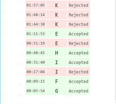 上午热身赛完看到红黄蓝气球吹的比较多,上来就先读FHG,G1y5 F1y9。林学长开了H、I,期间wcy&qjc讨论了E、K、C、A,好像都给出了写法。I因为一些实现上的问题WA了一发,'I2y31 H1y40。因为看起来wcy有很多题能写的样子,这个时候qjc&林学长开始肝D了。然后SBwcy开始写E,写了一个很蠢的假判断,怀疑做法出了问题打印给qjc看然后写A。qjc叉掉了E的制杖写法,重写了一下,E2y71。