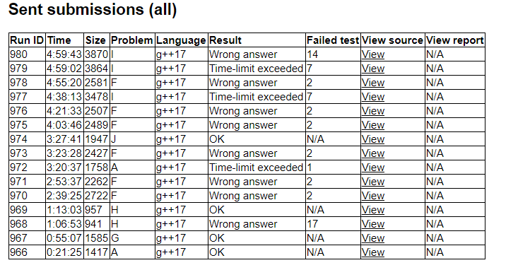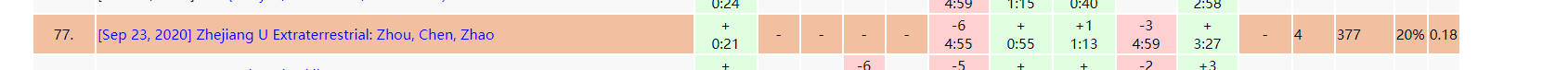 前期开题还挺顺利,进入中期后我(zgz)就掉到F的调试里面去了。此时队友应该是开了几个题但是没有开出来(病名为菜),进入后期时cyb和zyh好像是开出了I题,然后cyb去写,同时我给zyh一行行讲我的代码逻辑,但是这并没有什么卵用,还是查不出错。