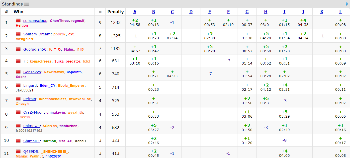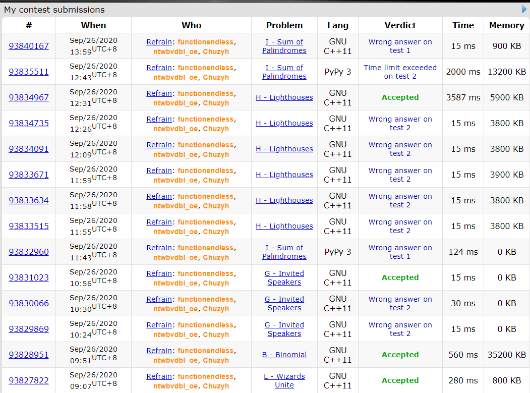 开场看题,czyh和fx各A了L和B,我们对B用FWT那么快就有人过感到惊奇。czyh和lmh讨论出G,czyh上机写并WA2,挣扎良久(30min)。czyh读题并发现漏看条件,换算法并立刻AC。同时fx和lmh看了C,想不出来并讨论出I,lmh上机写python并发现TLE然后下机,这段时间中fx和czyh讨论出H。czyh上机写并WA2,和lmh讨论50min后查出并AC。此段时间fx推出F(事后发现式子中一个符号错误)。