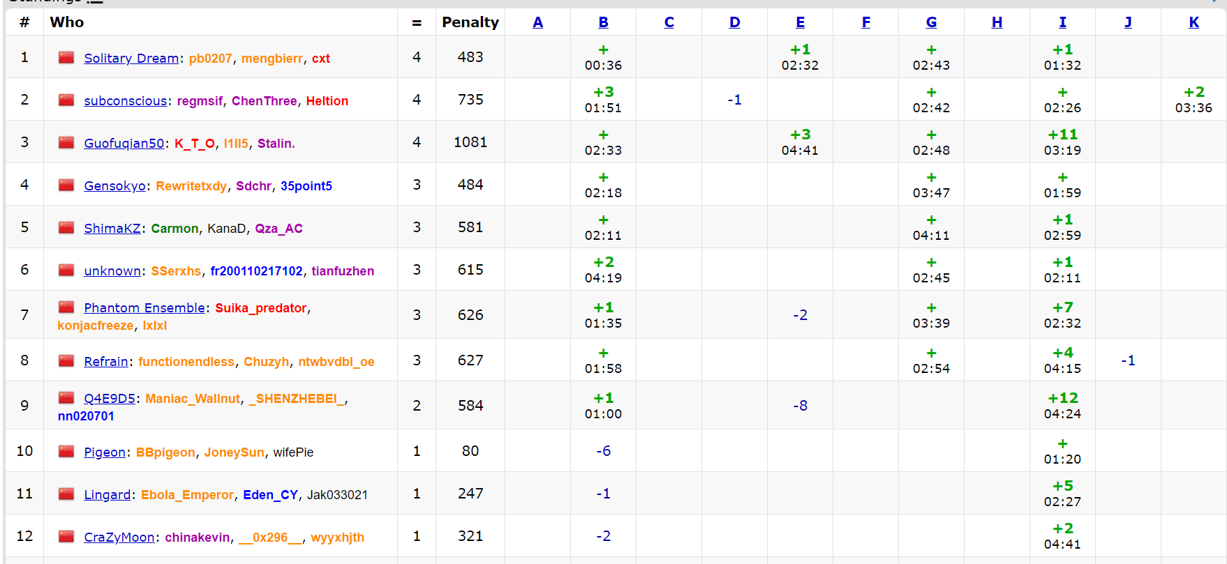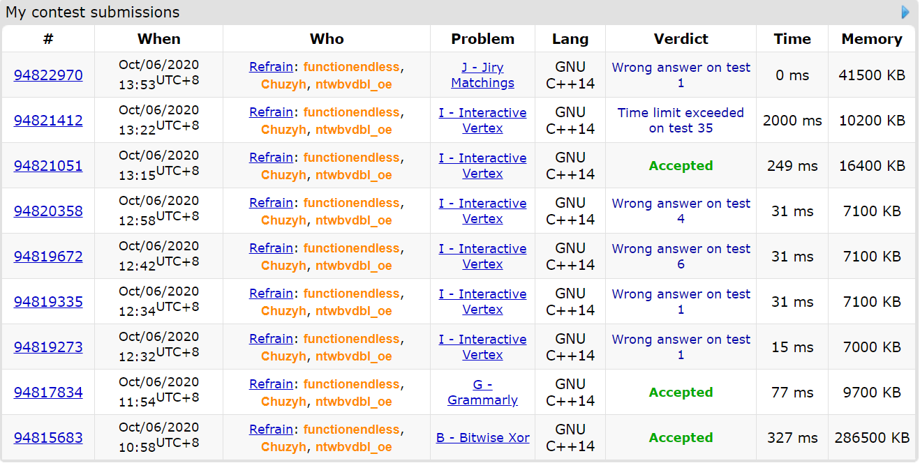 开场意识到这是无签到场,分工看了所有题,fx想出B并AC(2h),同时czyh和lmh讨论出G,czyh上机写G,没过样例,lmh把I题算法告诉fx,fx上机写I.一会儿后czyh过了G,fx继续写I,莫名WA,lmh帮忙调试,又挂了几次发现了板子,细节等错误后过I,之后czyh和lmh讨论出J,没时间写了.
