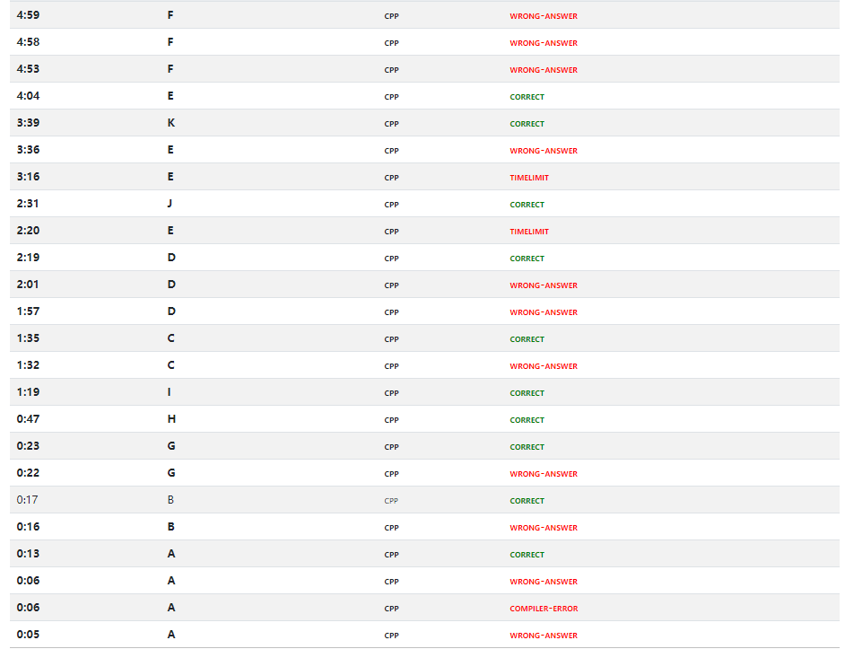 lmh开场开E,并信誓旦旦。fx开A,喂czyh,WA,改,WA,迷信改,WA,fx指着for循环里的变量并大吼一声,'''A4A13''',czyh想B出B,数组边界没清,'''B2A17''',fx和czyh想出G,多组数据没清零,'''G2A23'''。