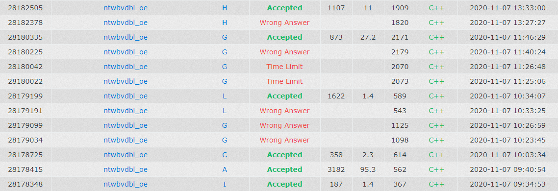 陷入僵局,czyh和lmh对着E和H大眼瞪小眼,都不会。fx在机上换了个做法,写完并TLE,发现特判加错位置,改了依然TLE。lmh读了读他的代码,发现复杂度有问题。fx挠了挠头,换了个写法,这次是WA,改掉bug后'''G6Y166'''。czyh上机对着E打表,并在OEIS上找到了优美的柿子,但是并不会O(n)推出。