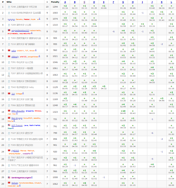 开题,fx读懂A的题意但还没睡醒,知道有人(场外)过了才意识到这题的sb,报了题意丢给czyh,A2Y10。接着跟榜看D,打表大师czyh马上发现规律,D1Y22。fx看H并继续不会,丢给了lmh,但由于表达不清lmh意会错了题意,得到真的题意后他大骂一声**然后秒了此题。散开看题,fx看了B并不会,czyh开始怼E,fx跑去看L,看完之后把题意丢给czyh,又溜去看C,结果C看着看着突然把L想出来了,czyh又精简了一下算法并把在机上意识模糊的lmh踢下去开始写,L1Y55,lmh意识清醒了之后H1Y75,fx想出C并开始写。