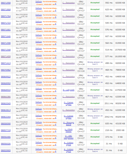 czyh继续快乐地刚E。lmh先写拍并拍出了错开始调试,fx也写拍然而啥都拍不出来。许久lmh调了出来,G2Y198,fx继续自闭。czyh终于丢掉了E并和lmh开始看别的题。fx黔驴技穷,只好讲了讲B的题意,czyh想出了B并把fx踢下去写,本机测了9s,在lmh强烈要求下换掉了vector,8s,lmh觉得cf的机子能过,于是B1Y252。