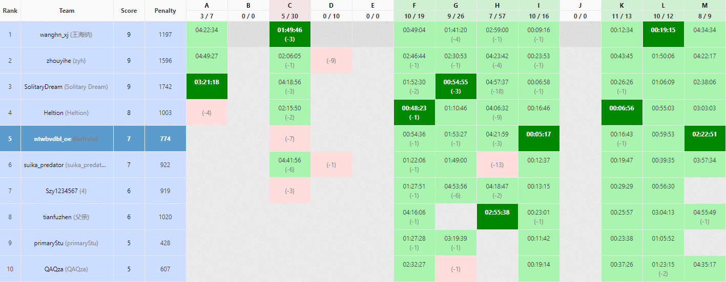 开场跟榜,czyh'''I1Y5'''(FB),lmh'''K2Y16'''。lmh写C写了一半发现不太会做,听了czyh的dp思路也不太靠谱,于是换czyh上机对F打表,'''F2Y54''',fx'''L1Y59'''。czyh给M打表,lmh和fx讨论G,机上的czyh听着听着觉得他会做G了,lmh觉得靠谱。czyh把表打出来,两人找到了前一半规律,于是czyh先写G,lmh继续找后一半规律,'''G2Y113'''。lmh看着表一头雾水,完全找不到规律,于是和fx讨论起A,两人做了前一半,后一半不会做。czyh写完G,又找到了M的另一半规律,但还差一个问题没解决。两人均不会,求助fx,同样不会,czyh重新读了题,发现这个问题实际不存在,于是'''M1Y142'''(FB)。
