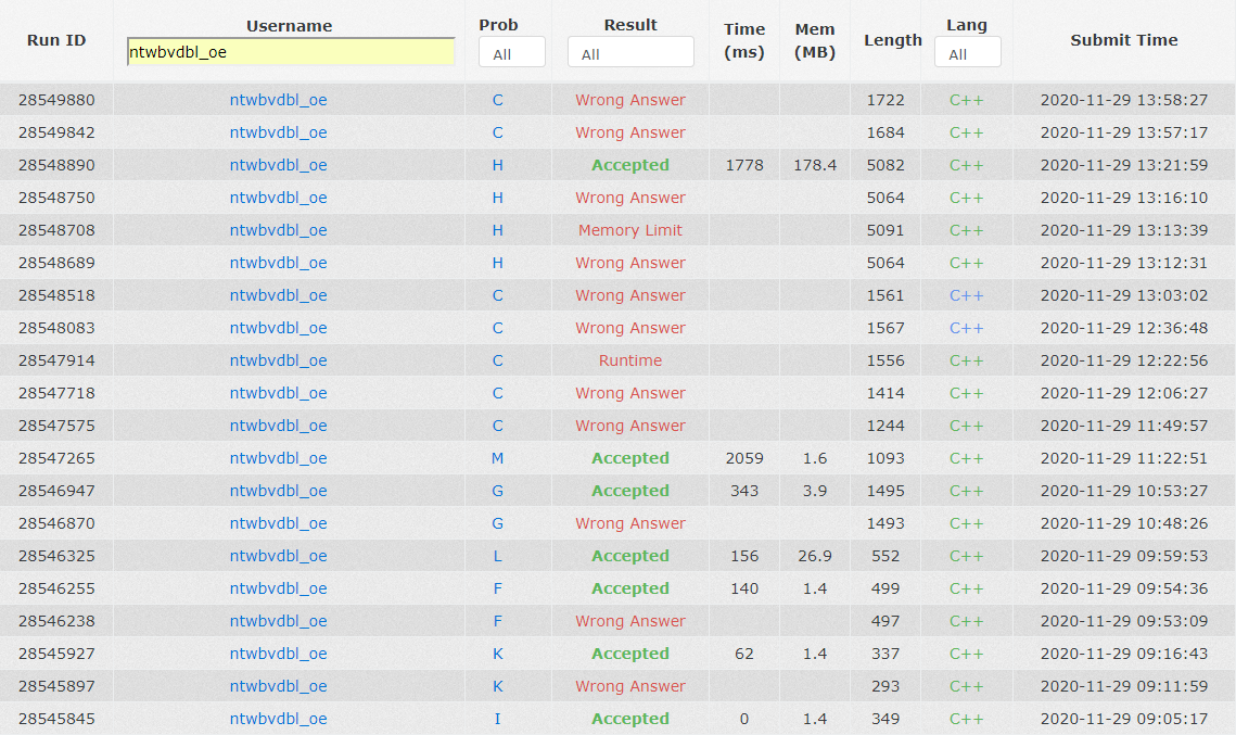 开场跟榜,czyhI1Y5(FB),lmhK2Y16。lmh写C写了一半发现不太会做,听了czyh的dp思路也不太靠谱,于是换czyh上机对F打表,F2Y54,fxL1Y59。czyh给M打表,lmh和fx讨论G,机上的czyh听着听着觉得他会做G了,lmh觉得靠谱。czyh把表打出来,两人找到了前一半规律,于是czyh先写G,lmh继续找后一半规律,G2Y113。lmh看着表一头雾水,完全找不到规律,于是和fx讨论起A,两人做了前一半,后一半不会做。czyh写完G,又找到了M的另一半规律,但还差一个问题没解决。两人均不会,求助fx,同样不会,czyh重新读了题,发现这个问题实际不存在,于是M1Y142(FB)。