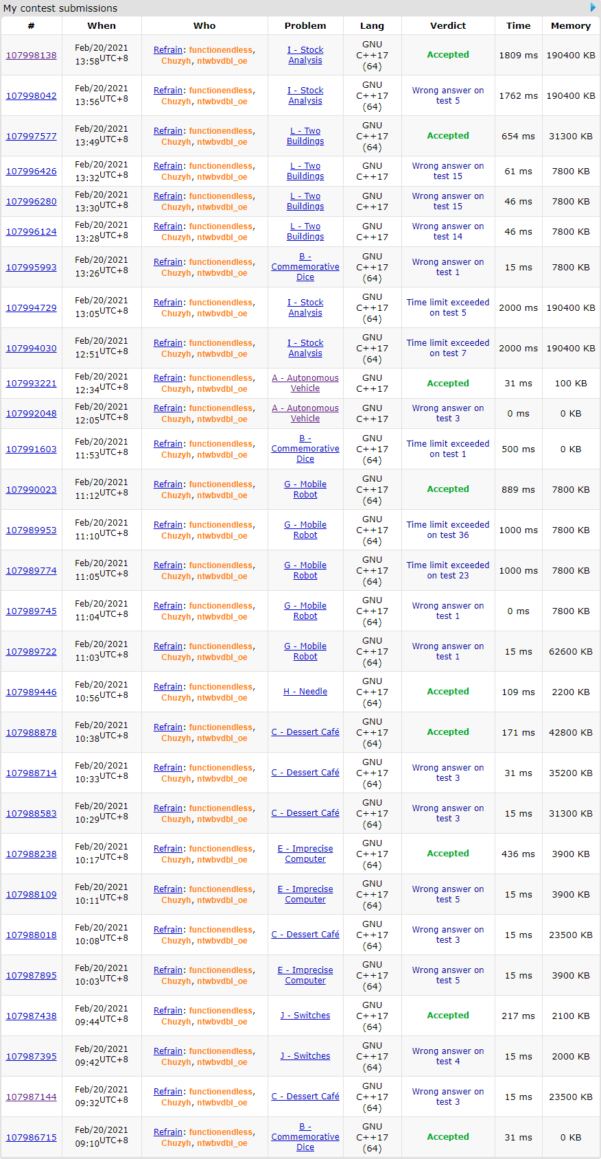 开场fx签B,B1Y10,lmh对着E挠头,czyh把J丢给fx,fx一眼秒了之后丢回给czyh,但czyh决定先写C并让fx检查C题意正确性。fx看C看得一脸懵逼并且样例也非常弱,让czyh交了一发,果然WA了。于是fx继续钻研题意,czyh写J,WA了一发后AC,J2Y44。fx还是看不懂C题想说什么,看lmh依旧看E并面露难色,于是和lmh换题。