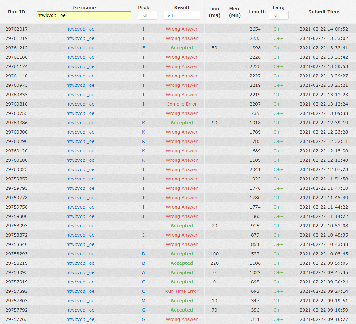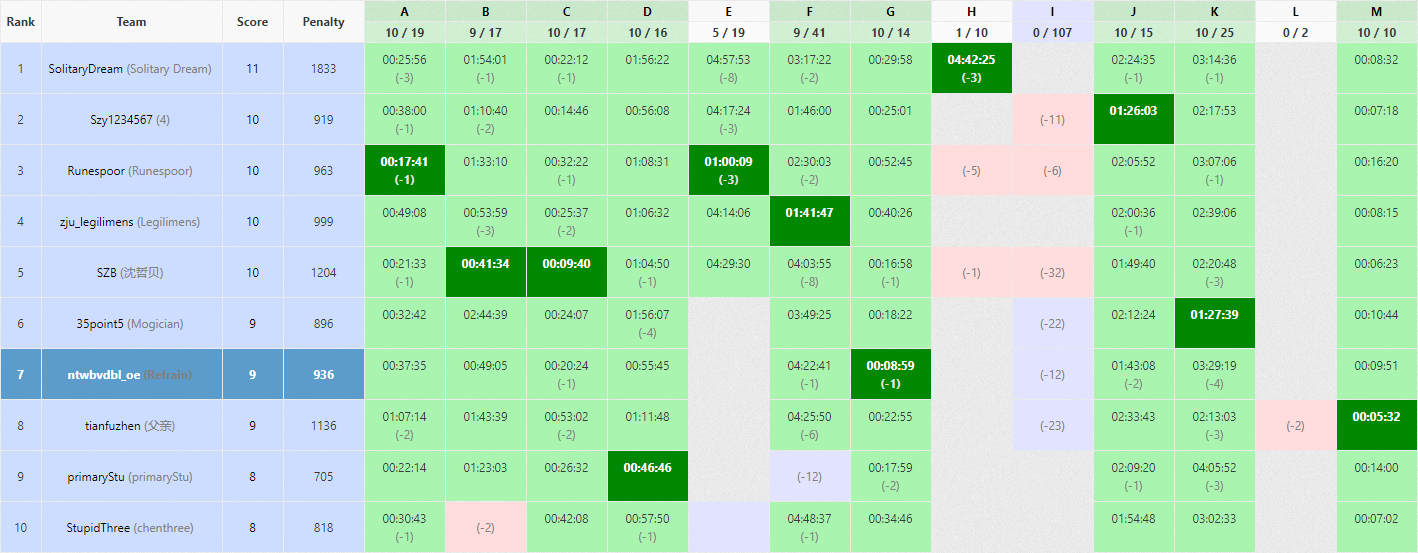 fx开出K丢给lmh,lmh改了两次做法,却都过不了样例。写完交上去WA了,经过对拍陆续加了3个特判,K5Y209。fx转头很快开出F,写完没过,开始debug。期间czyh乱搞I依然无果,连9/100都难以达到。