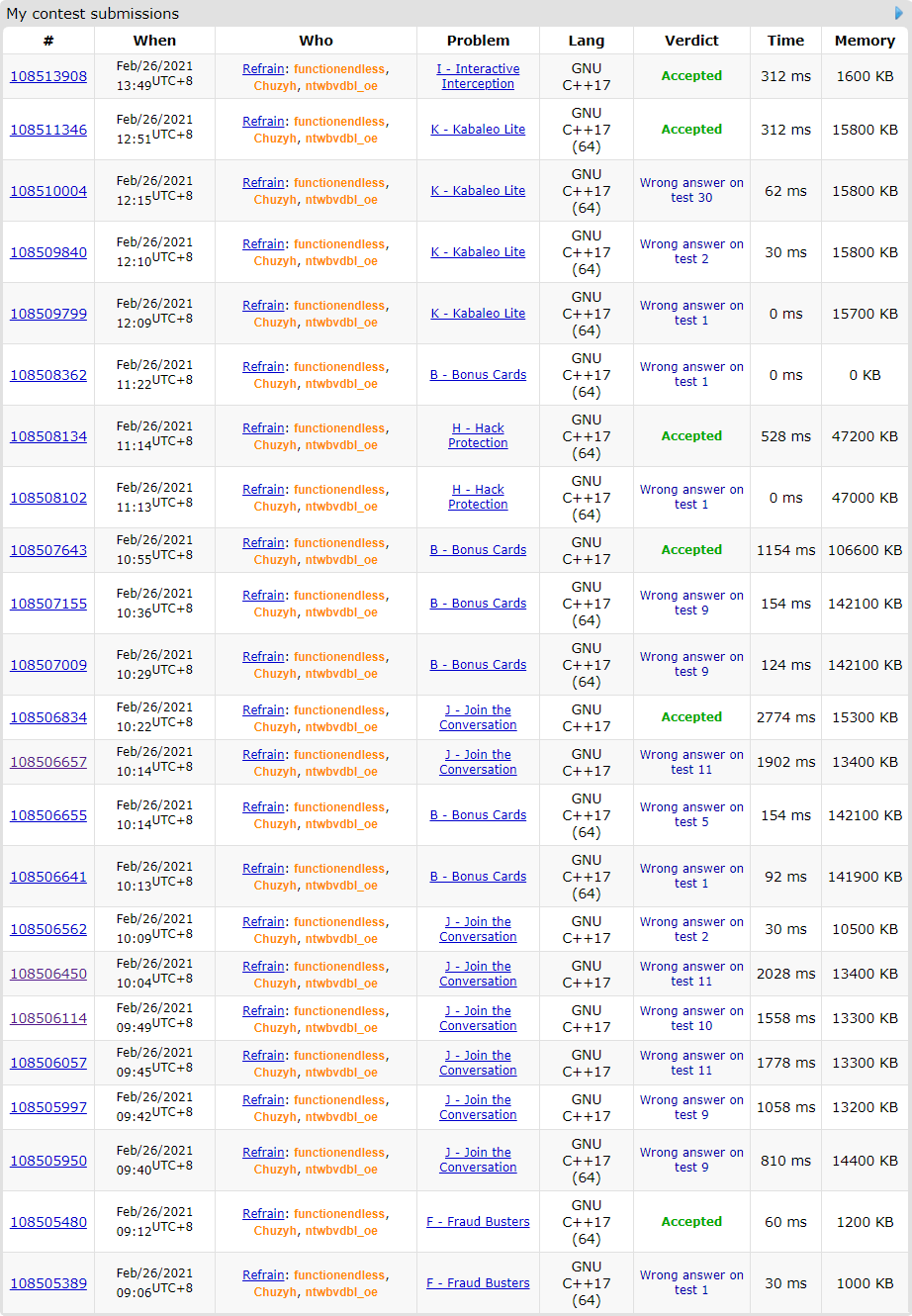 期间解放出来的czyh和lmh讨论出了H,lmh上机写H,写对拍调了调,又忘记了文件IO,H2Y134。czyh上机写I的checker,不久fx开出K上机,写完忘记了文件IO,改完WA了。czyh胡了一个做法,但效果不好。fx写了dmk,并assert出了一些问题,改完依然WA。lmh向拿外卖回来的czyh讨论了一会,发现他保存的状态不合理,于是向他输出了一些idea,czyh吃完后终于想出了正解。fx对着lmh小黄鸭,发现了2个小问题,改完K4Y231。最终czyhI1Y289。