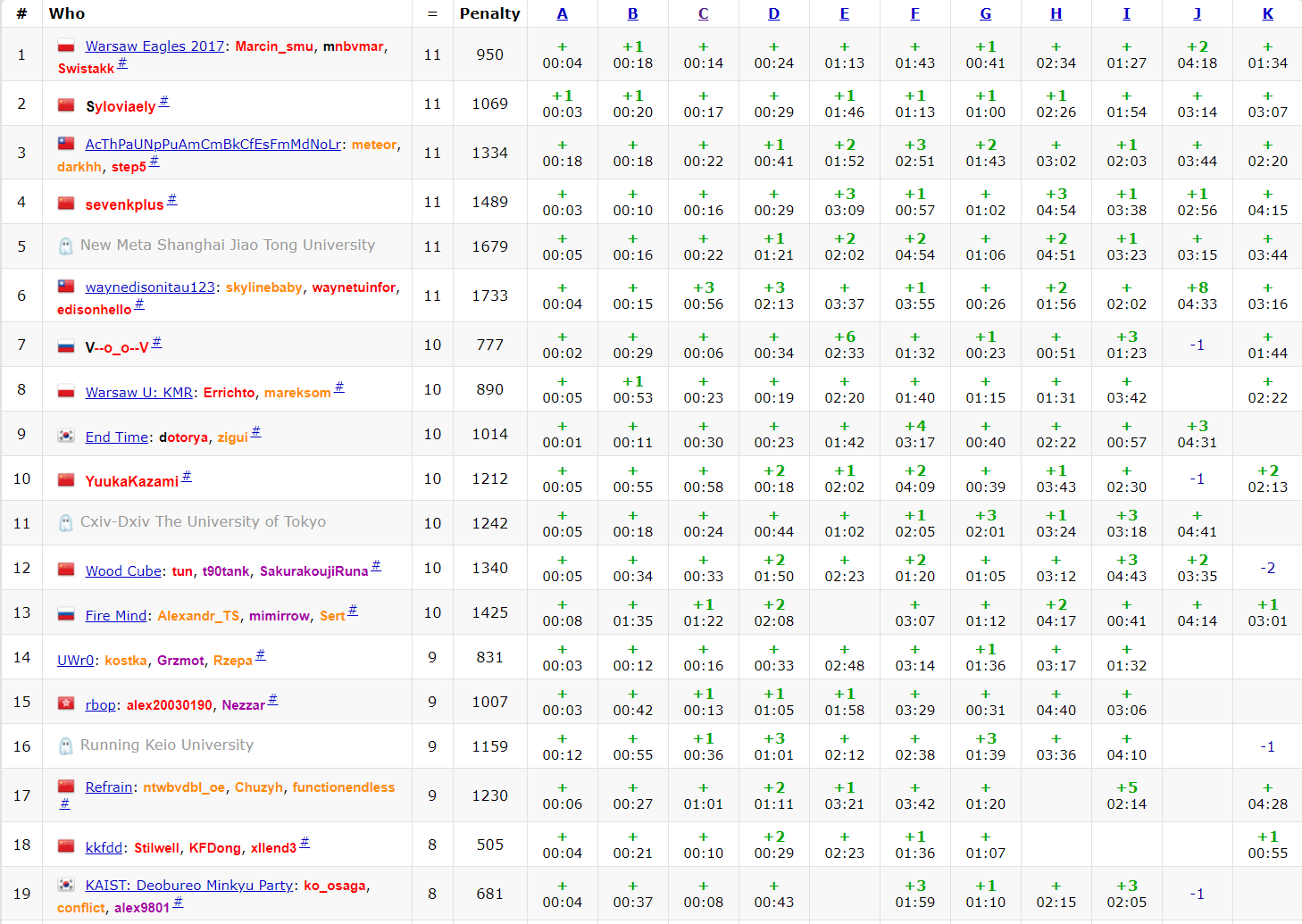 开场fx签A'''A1Y6''', lmh看E,czyh倒开,之后跟榜看BC,czyh写B于是'''B1Y27''',fx和lmh想C,fx口胡C后扔给lmh写,lmh写了很久发现没过样例之后开始静态调试。在此期间fx和czyh秒了D,于是czyh上去写D,但收获了一发MLE,czyh一脸懵逼下去调试。lmh发现了问题'''C1Y61''',czyh继续改D,MLE变WA,还在更前面,czyh立刻发现自己的sb错误'''D3Y71'''。当czyh和lmh在机上纠缠的时候fx自闭G,胡了个结论后给lmh听,lmh觉得没问题,于是fx写G,'''G1Y80'''。czyh对I题很有想法,于是连爆3发把一边的fx看傻了,fx过去帮忙看I,于是和lmh频繁上下机,最终'''I6Y134''','''E2Y201'''。接下来fx刚F,czyh刚K,lmh刚J。fx发现自己被带入惯性思维后更正思路并尝试了一发'''F1Y222''',czyh开始阅读国家队论文,不明就里就过了K,'''K1Y268'''。最后lmh抄J的板子但不知道为什么就是比答案大,lmh感到质壁分离。