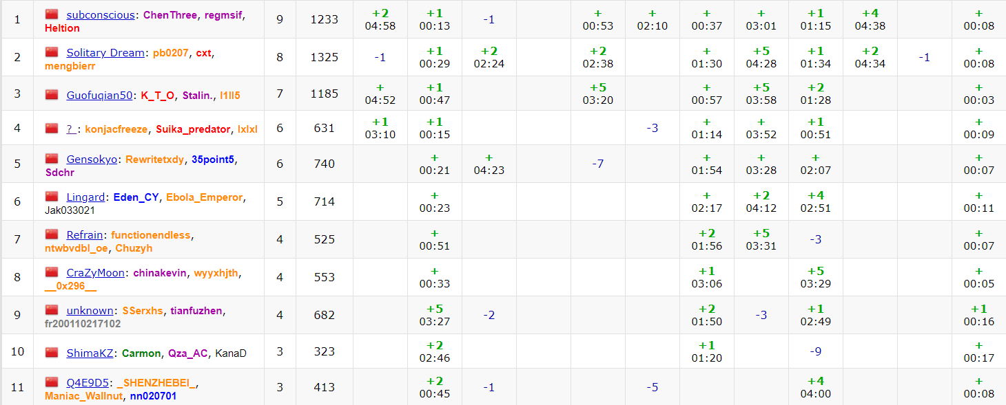 前期签完到就开始卡题,Emmy开场就冲了A,他一直担心min_25会T,Grammy觉得不可能T,然后他冲了一发TLE,表示这题是某国外算法,但是他没带板子(不久后py到了Tony的板子)。E的题意没注意到一个很重要的限制,H的题意以为是在端点不相交也不会做。中期三人卡三题,结果中间很长一段时间机位上没有人,到了还有一个半小时的时候,几个题意的问题都解决了,同时还开出了其他题,手上握着很多很多题,但是机时显然是写不完了,Grammy先上去把H写了,然后Emmy上去写F,本来觉得至少还能冲一题,但是Emmy wa了,然后就没有然后了。