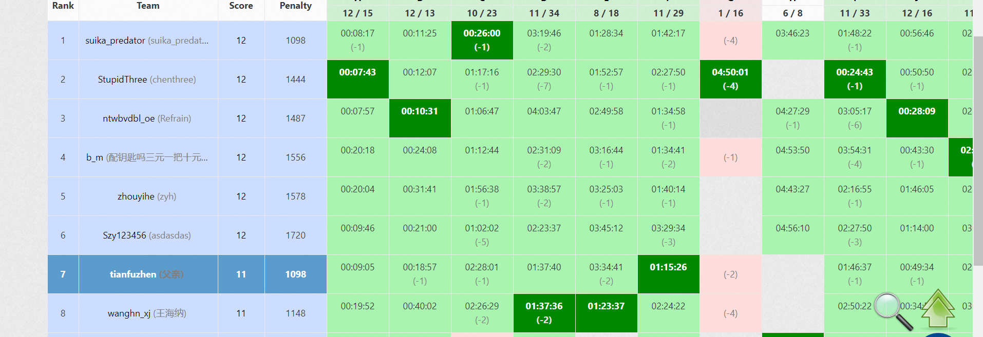 这场lzh迟到了2h所以前2h只有两个人。。。开场就过了两道签到A和M。然后lxy写B,我看D然而做法假了,把D扔给lxy之后发现I是输入只有一个数的构造题于是去想I,然后lxy又连续签掉了JLF,我找到一个构造方法上去交一发WA了。然后lxy又上机过了D,我把之前的做法改了一下之后再交一发I也过了。这个时候lzh终于到了,我和lzh讨论了一下C之后发现是结论题于是上去写结果WA了。同时lxy看K题,很快也有了思路就上去写。我发现C的边界点扔给lzh一测发现炸了,改掉之后就过了。这个时候才过半场。K的细节比较多所以lxy交WA了两次还是没过。看榜发现剩下3题中E过的最多于是我去想E,lzh去想已经看了一半的G。我很快想到E的一个疑似正确的构造方法然后就换掉lxy开始写,让lxy静态调试。写一半lxy就调出错然后把K过了开始想最后一道H。我把E写完测完样例交了一发WA了,就拉lzh过来调,发现最大最小取反了而且还没考虑层的问题,然后就直接重构,3h30min左右E过了。这时榜基本上G和H都没人做,所以我跟lzh看G,lxy继续看H。4h左右lzh和lxy几乎同时有思路,然后lxy先上去写,结果写完样例死活过不去。。。4h30min换lzh去写G,lxy再次静态调试。最后G过了样例就交然而炸了,而H一直没过样例。因为时间不够所以两道题尽管做法都正确但都没调完。