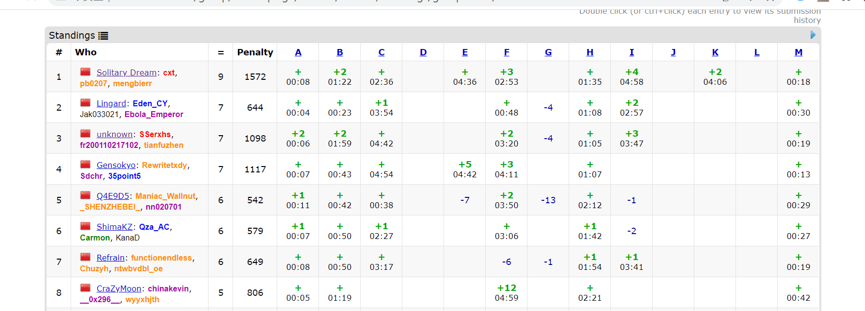 看着比赛开始了然而两个人一个在厕所一个不知在哪,没按原定顺序开题,先看了一眼 A 秒了但乱 wa,6min+2 不知在干啥。然后lxy 回来了恢复倒看,正好 M 也有人过了,看了一下发现题面很长,读懂题意感觉是个数学题,一看范围是个神必题,很快签了,lxy 写 B 题。我看了 I 知道是个迟早能写的板子题,又看了 H 可以秒,就换上去先 A 了,然后 lxy 一直在 debug,听她说是个表达式求值题,立刻就想到前几天写到的 长存不灭的过去,逐渐消逝的未来 ,写了个表达式树 wa 飞了,发现题意沟通有误没说可以重排数字,于是代码复制24份过了。接着和 fr 先后双开 I 和 F,均 wa 飞,让 lxy 给我造了个数据但我感觉强度低没测,lxy 又给 fr 造了个数据结果把我的题卡掉了,调了一下调过去但又 wa,测了 lxy “低强度”数据发现题目转化出锅,改了就过了,fr 也调过了 F 题。时间所剩无几,我听了 G 题是基环树哈希让 fr 给我写了个基环树找环自己凭记忆写了树哈希,同时 fr 和 lxy 攻 C 题,然而 G wa 飞,肉眼调试同时 lxy 上去完成了 C 题意外 AC。