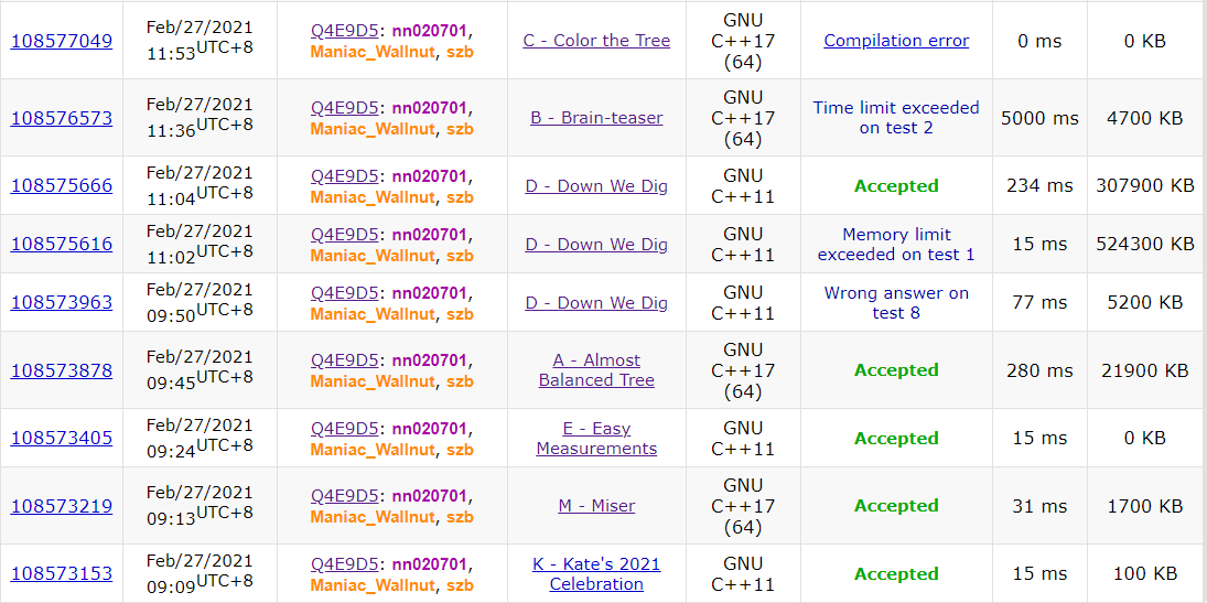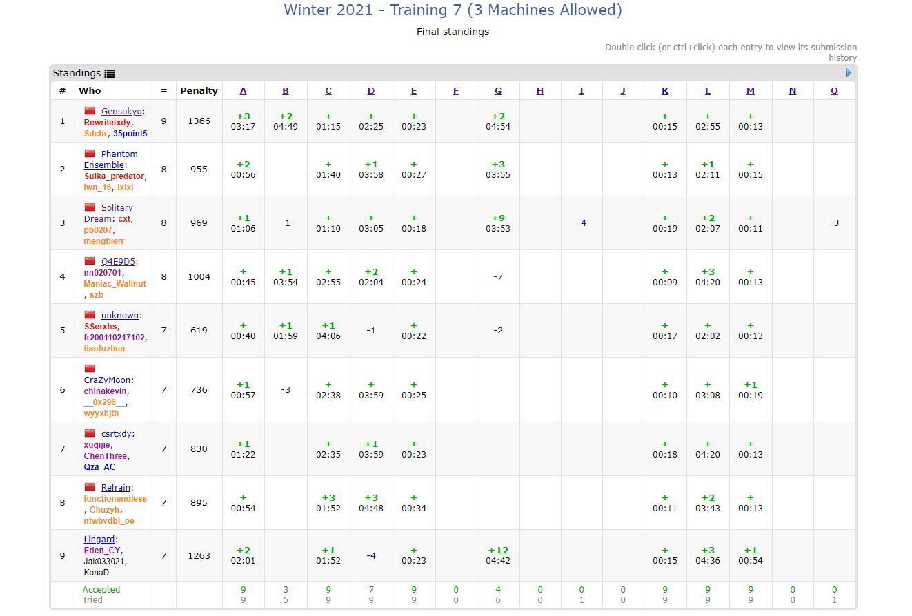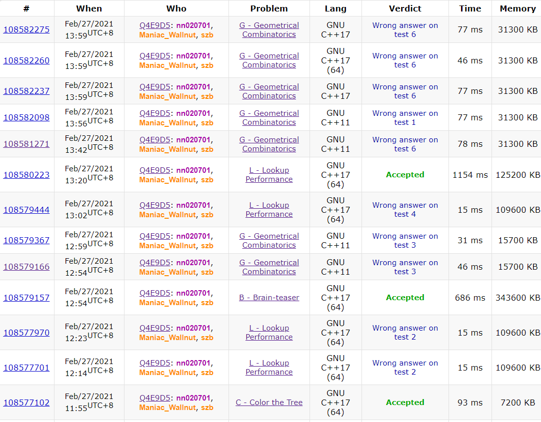 ② 如何确定要枚举的p? 我们先处理掉那些p3 于是得到整体算法流程: 筛小素数得到小素数集合P,先处理存在(a(x1+x2)+b)%p=0的那些大质数p得到集合Q,再对PUQ分别算出哪些f(x)要试除。总共试除的质数每次大约是7e6. 细节: ① Cipolla算法简介:() ② 上面②步中,枚举x进行处理时,当a,b都%p=0时是要让所有x都试除的,如果有%p非0才要求-b/a%p再筛。因为这个WA17了一年。 ③ 对于特别大的不可快速幂质数:有可能出现一个f(x) = p1×p2,p1是231.5以上的大质数(不可以快速幂取逆元),p2是6e5以上的大质数,而p1有x1和x2而p2没有(除不掉),导致程序让p1*p2而非p1进入答案统计。严格来说,p1有可能回取到1e10,1e11,这需要写其他求逆元方式,但我的程序在第二步强行让3e9以下的质数都进入试除(1e9,2e9都不行)就在3.8秒通过了。 ④ 直接(ll) sqrt(x) 不用担心炸精度,即使x有1e17级别。 G:整体右转45度,那么只需要对一条一条水平线和三角形求交,用组合数公式算一下即可。whn在实现时采用“先算三条线段与水平线的交点然后舍去在三角形外的那个”的方法,然后判点是否在三角形内的过程中炸了精度。 H: I: J: K: 签到。 L:签到 M:签到 N: O: