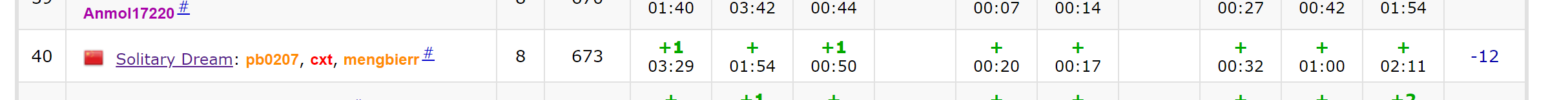 pb发现J要用网络流解决,于是上机,J1Y131,同时pb在上机前给出了A的做法,其他二人后都觉得很对,于是cxt上机,由于做法有些复杂,A2Y209。pb提出一个K的做法,但是有点难写,由于D和G题意过于复杂加上几乎没人通过,于是全员做K,由于卡精度等原因最后没有通过,留下一个美丽的-12。
